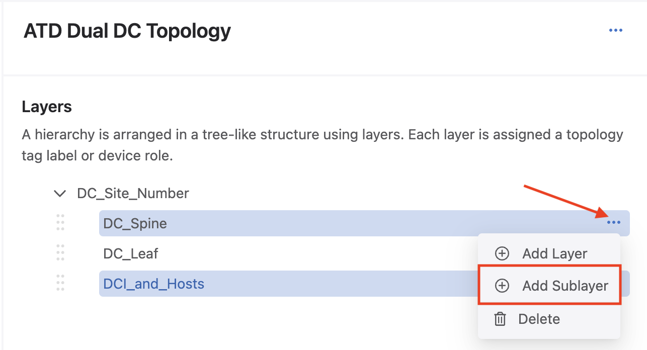 layersby clicking the 3 ellipses next to DC_Site_Number, and clicking Add Sublayer.Device Role:DC_SpineDevice Role:DC_LeafDevice Role:DCI_and_Hosts