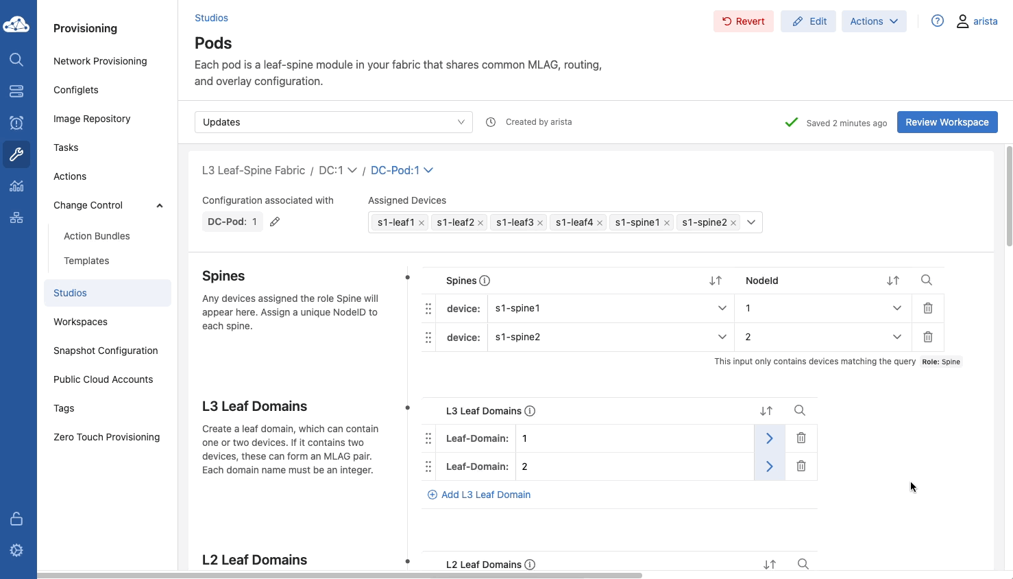 Let's assume that after the network configuration has been generated and deployed by Studios, we want to make a change to some of the settings we used. Because these configurations are generated by the data models inside of CloudVision, we'll see how simple it is to made fabric-wide changes with a few steps.