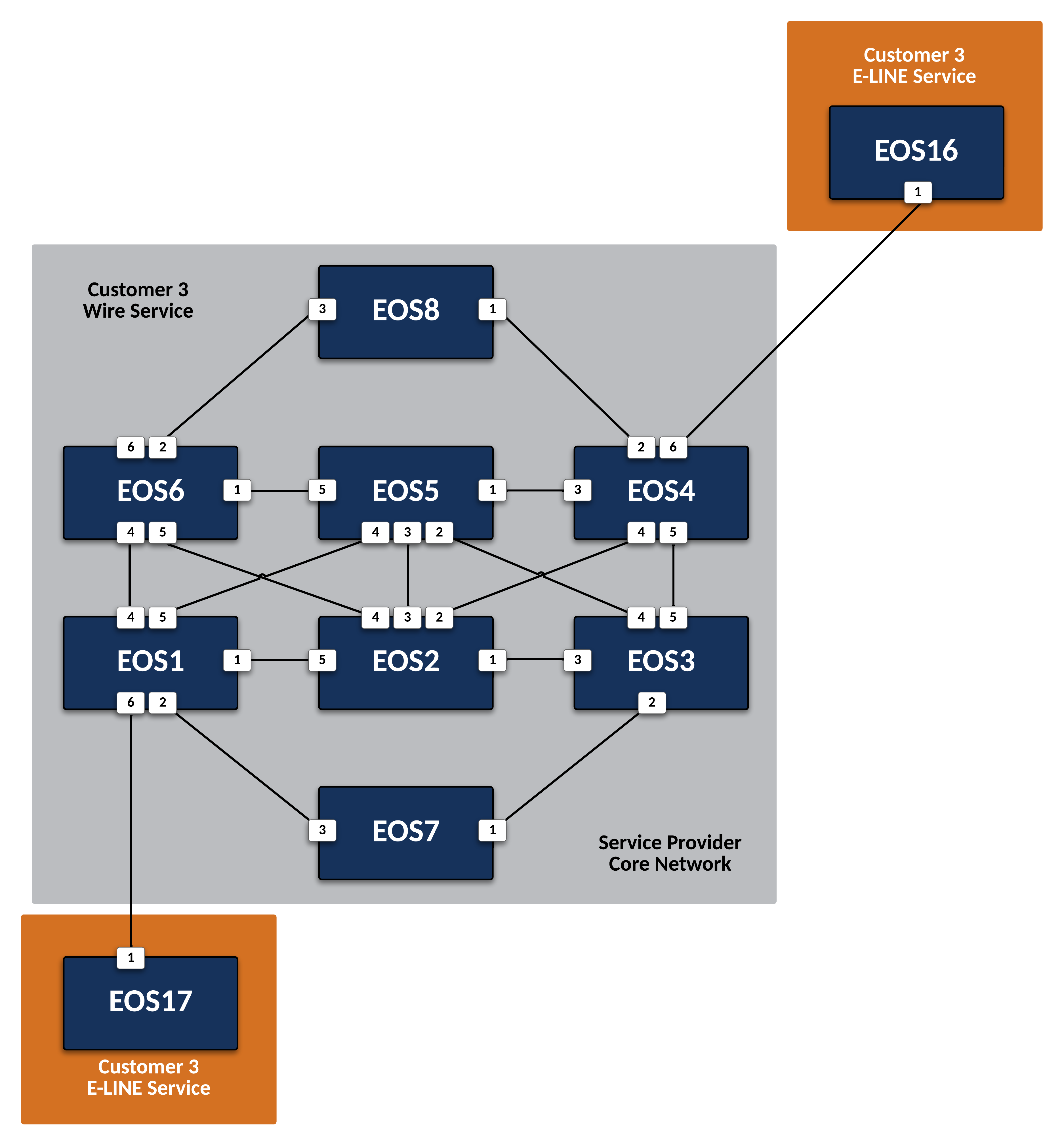 1. Customer-3 is attached to two Service Provider nodes, EOS1 and EOS4. These will be PE nodes. Since this customer will require a Layer 1 Wire Service, create a local patch and use an LDP Pseudowire to advertise the customers port to the other interested PE.