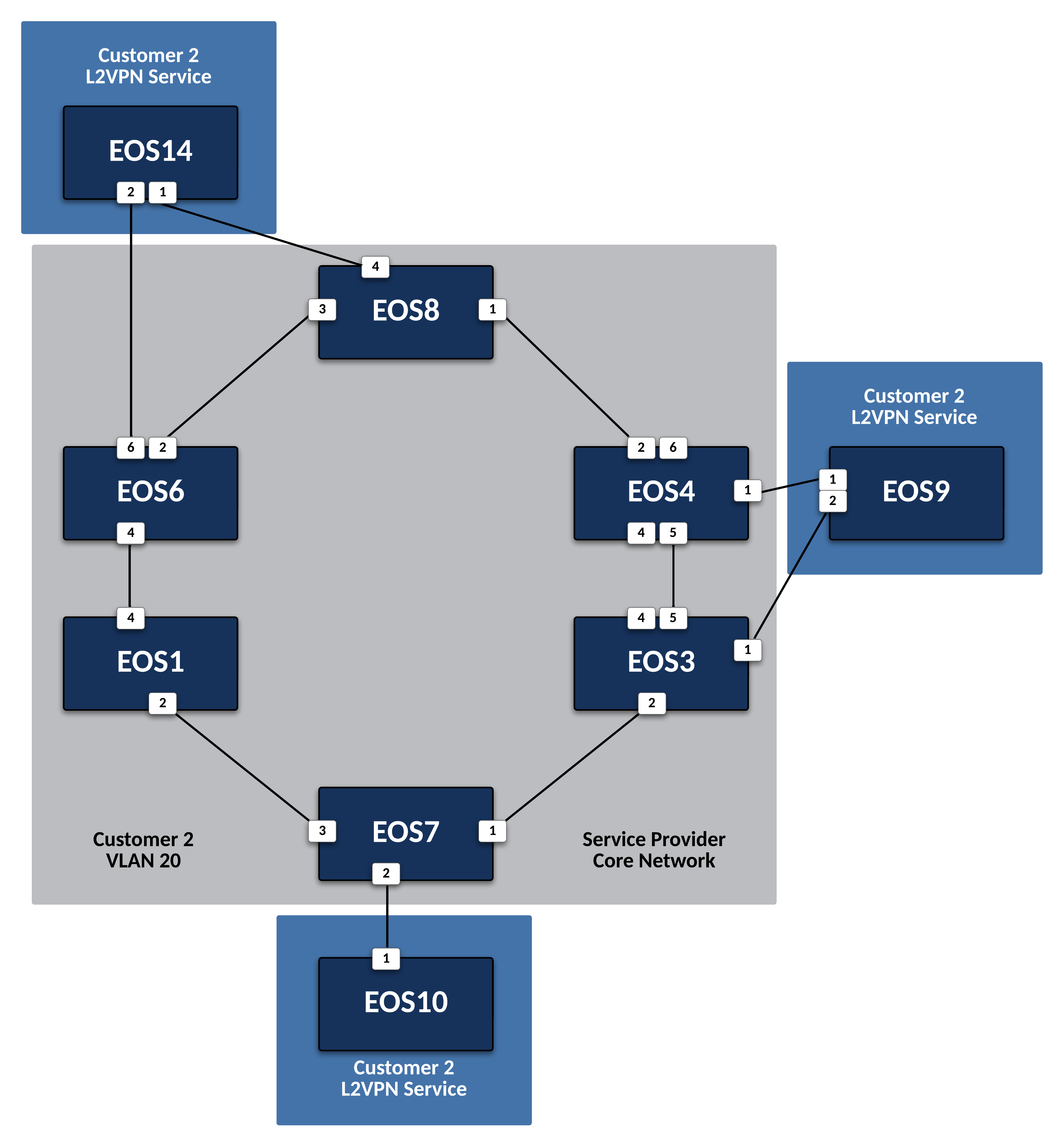 EOS3,EOS4,EOS6,EOS7andEOS8. These will be PE nodes. Since this customer will require a Layer 2 VPN Service, create a VLAN for their traffic and use EVPN to advertise the customer MAC addresses to other interested PEs.-