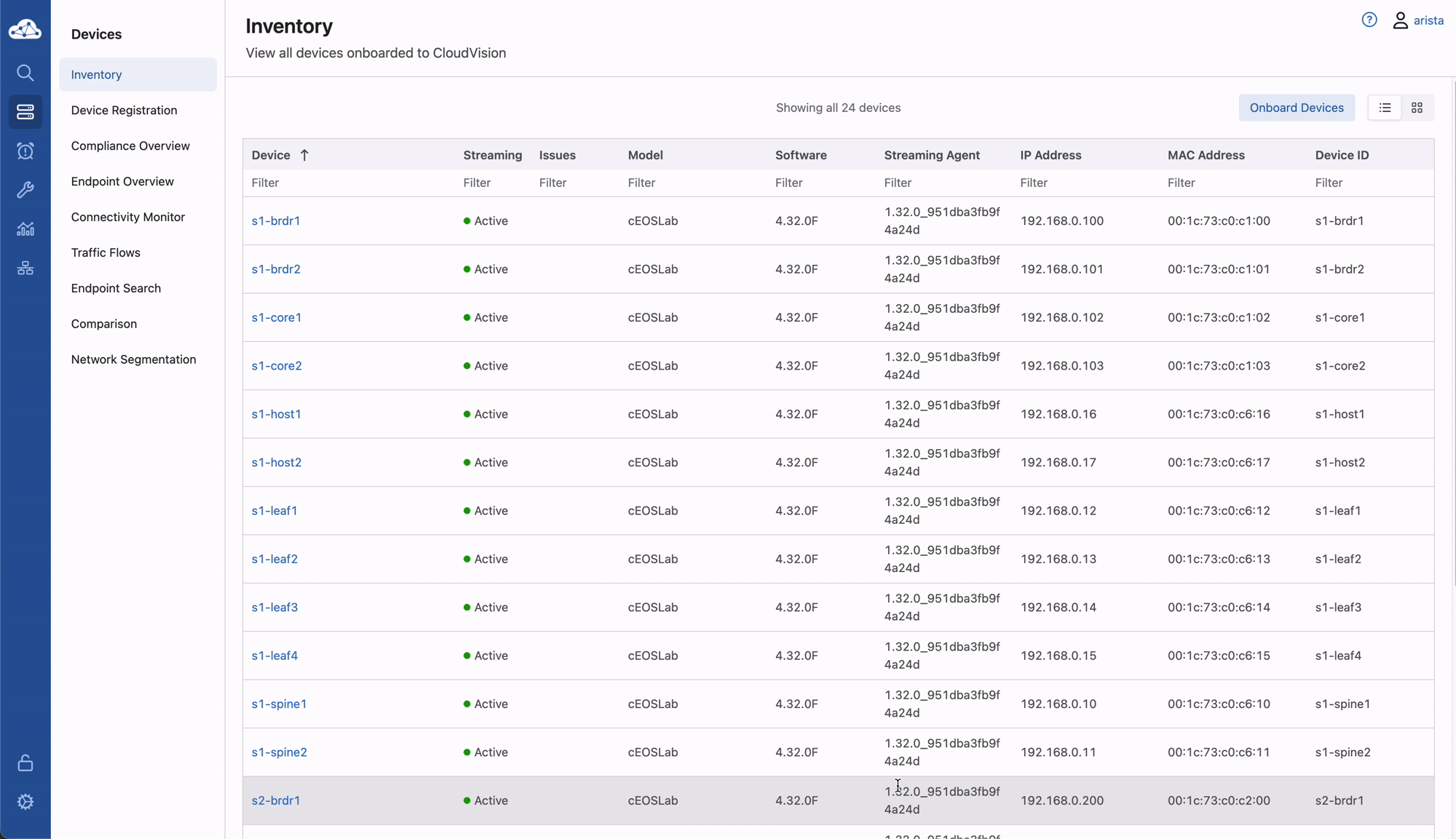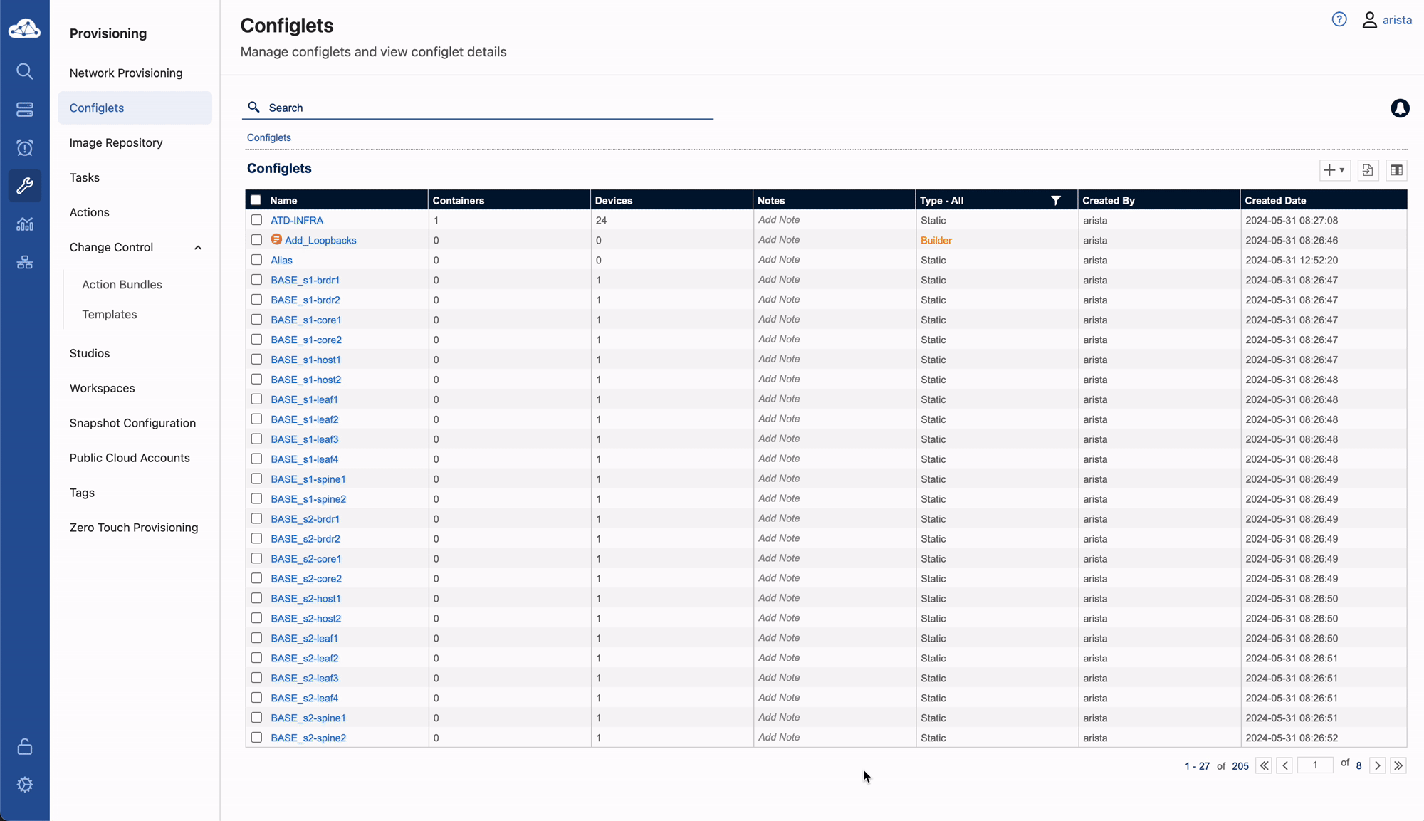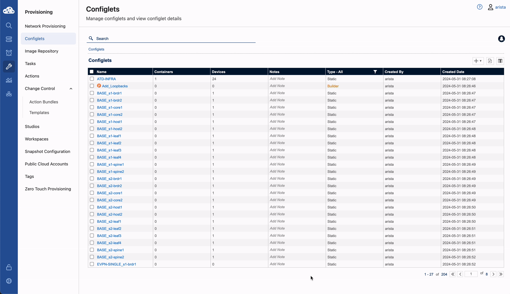 All of the switches have a base Configlet. Additional Configlets have been defined for AAA and VLANs.