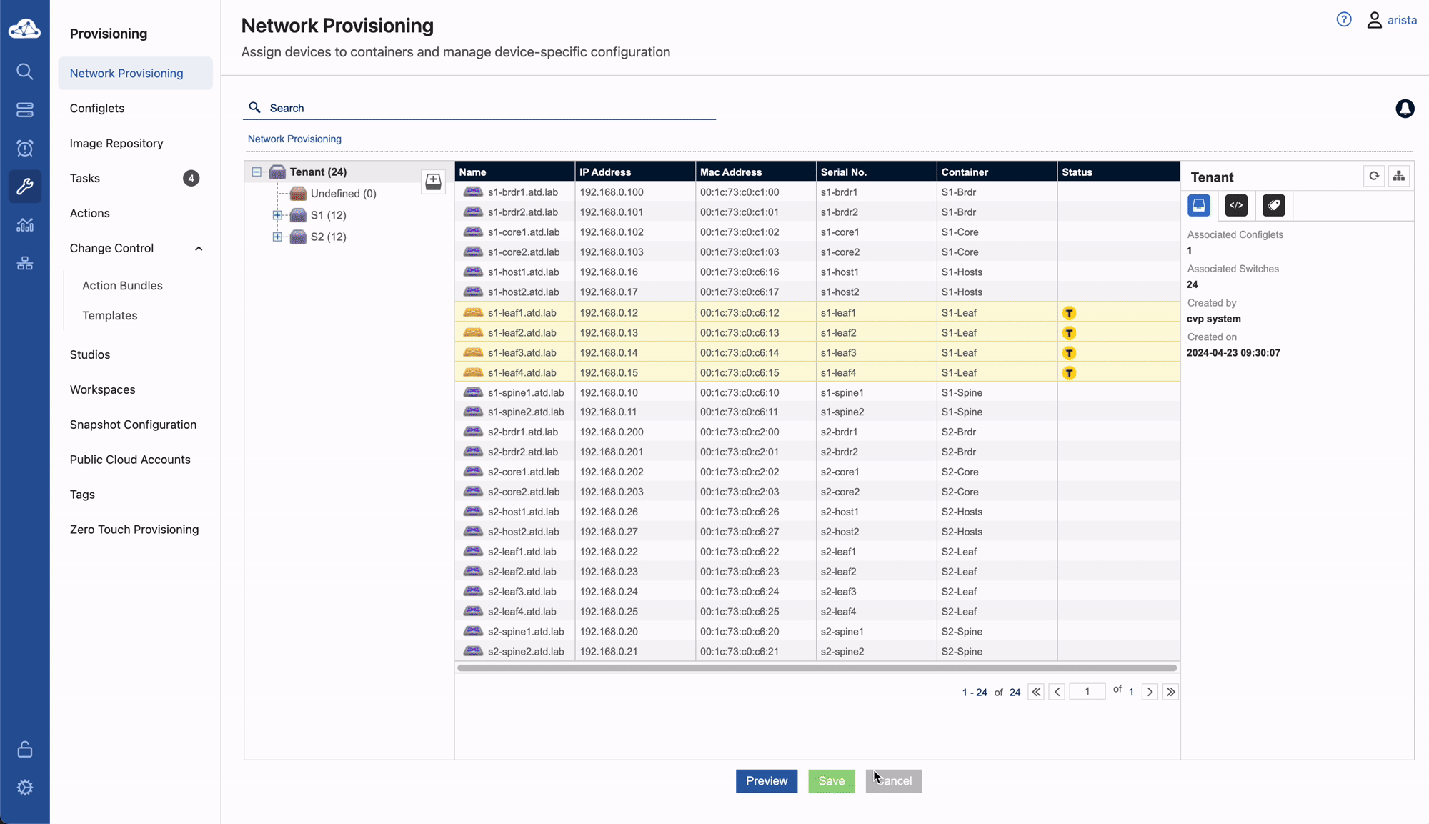 1. To apply the Configlet, navigate to Network Provisioning expand the S1 container, right click on the S1-Leaf container and select Manage -> Configlet.