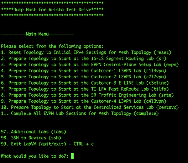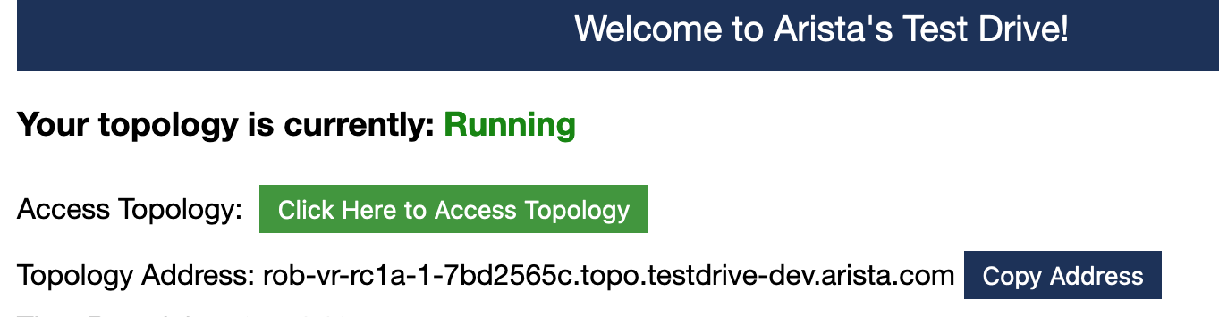 2. SSH to the public address assigned to the LabAccess jumphost server (this is the Topology Address shown in the “Welcome to Arista’s Test Drive!” picture below). The username is arista and the password is your unique lab password: