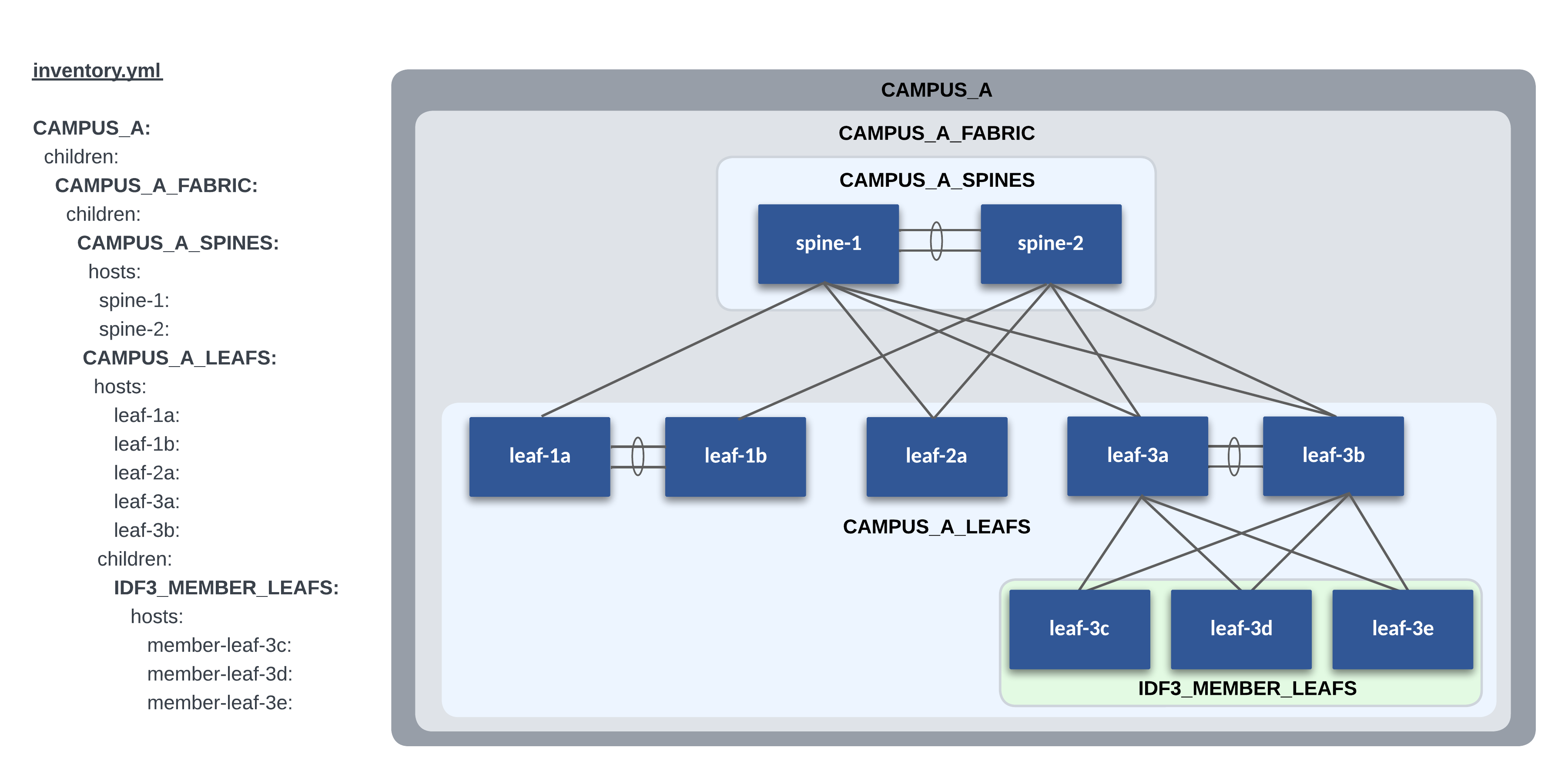 At the Fabric level (CAMPUS_A_FABRIC), the following variables are defined in group_vars/CAMPUS_A_FABRIC.yml. The fabric name, node type defaults, and interface links are defined at this level. Other variables you must supply include: