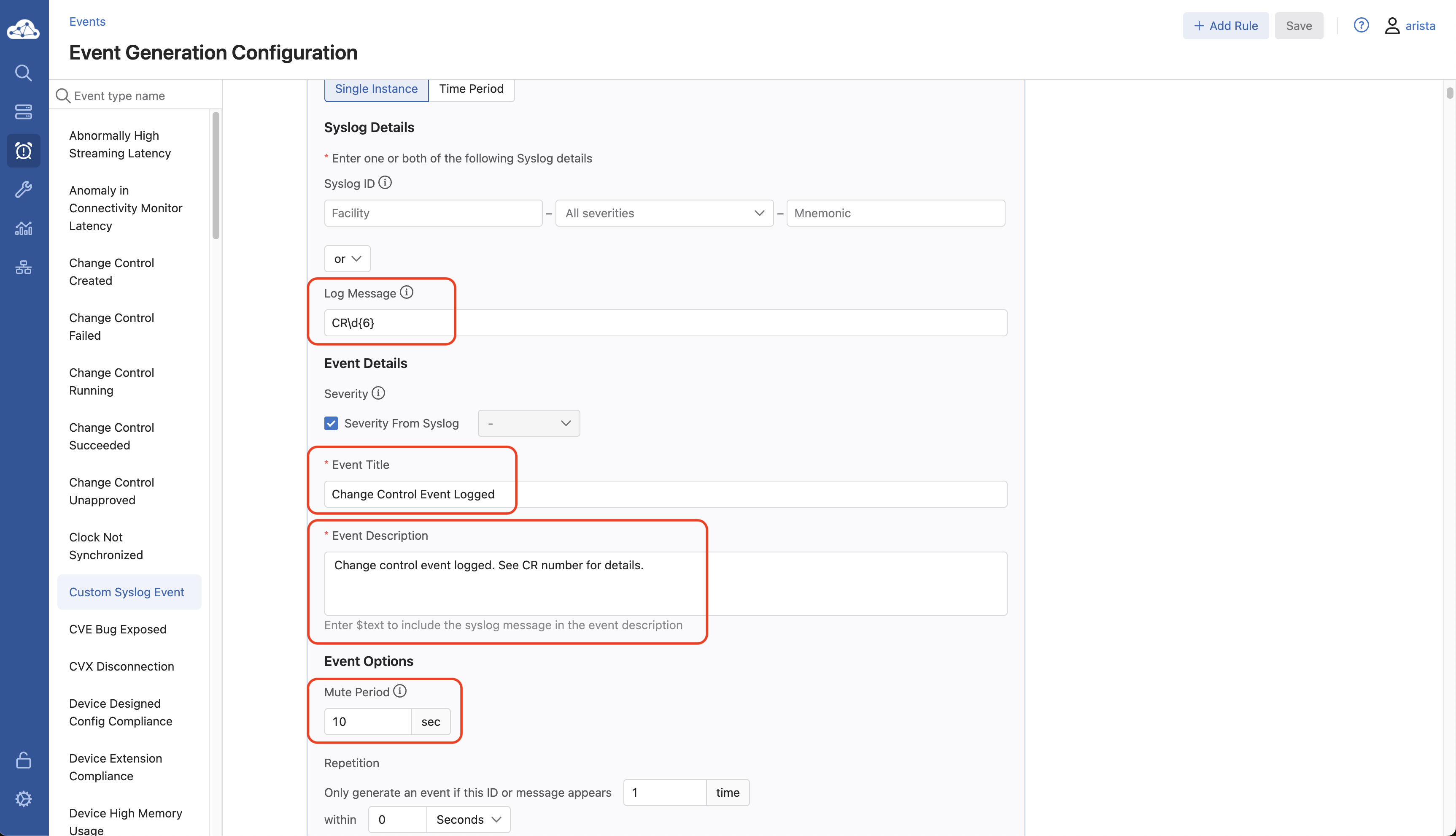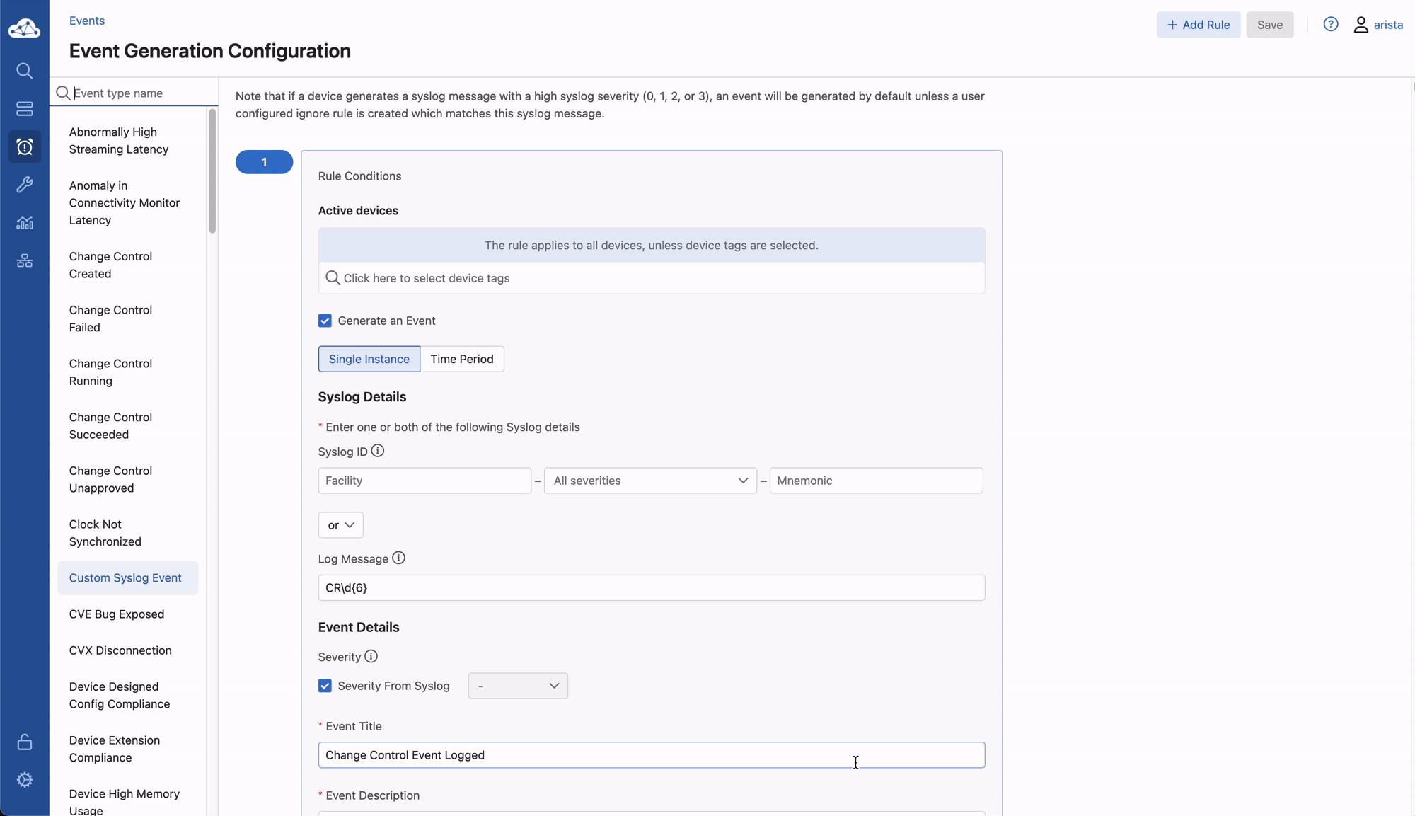 A custom event based on a specific syslog entry can be created with little more than a regular expression (aka regex) to detect and match an occurring log message. Or this log could be triggered by an EOS Event-Handler as part of the action. In this lab we will use the EOS CLI to send log messages that CVP will detect and create an Event accordingly.