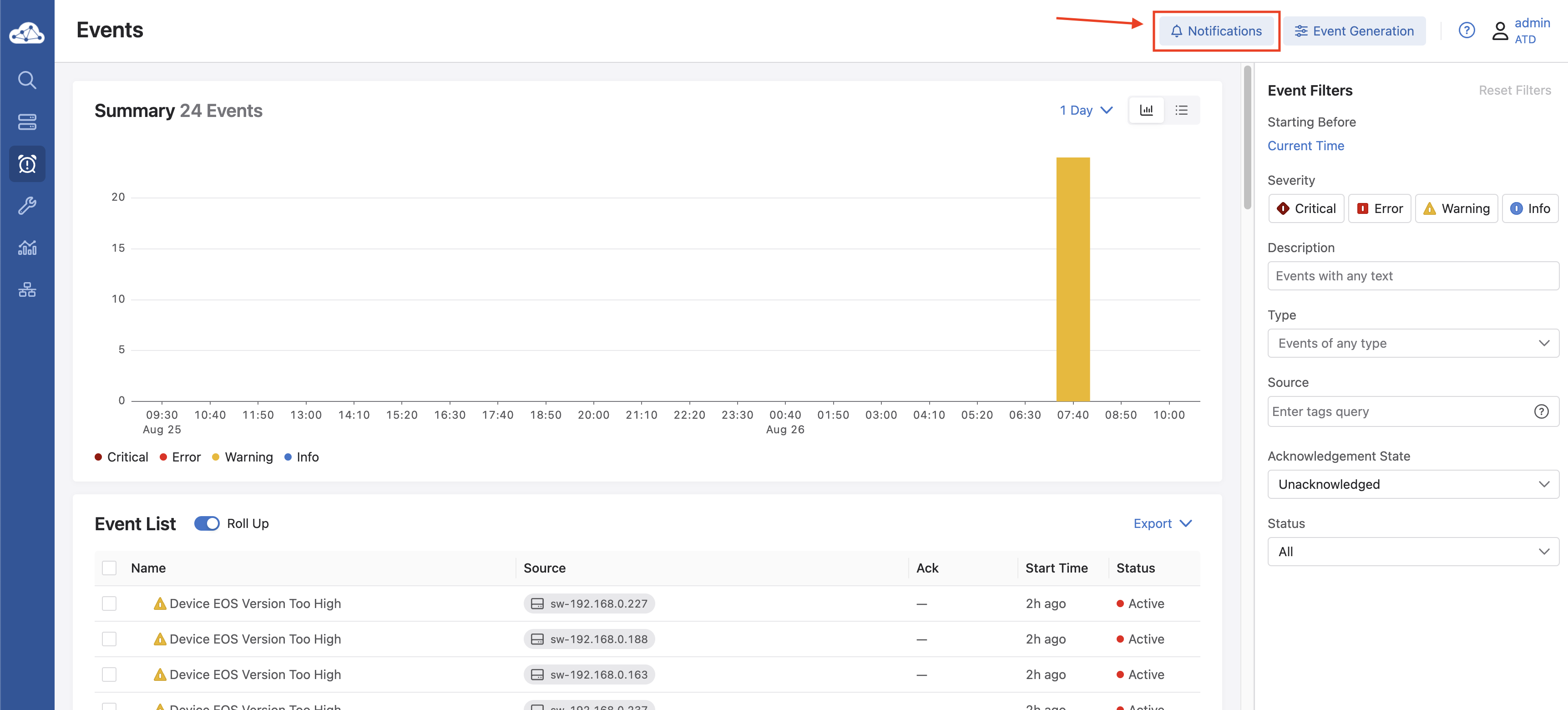 2. Now click on Notifications on the upper right, to customize Event Notification settings.