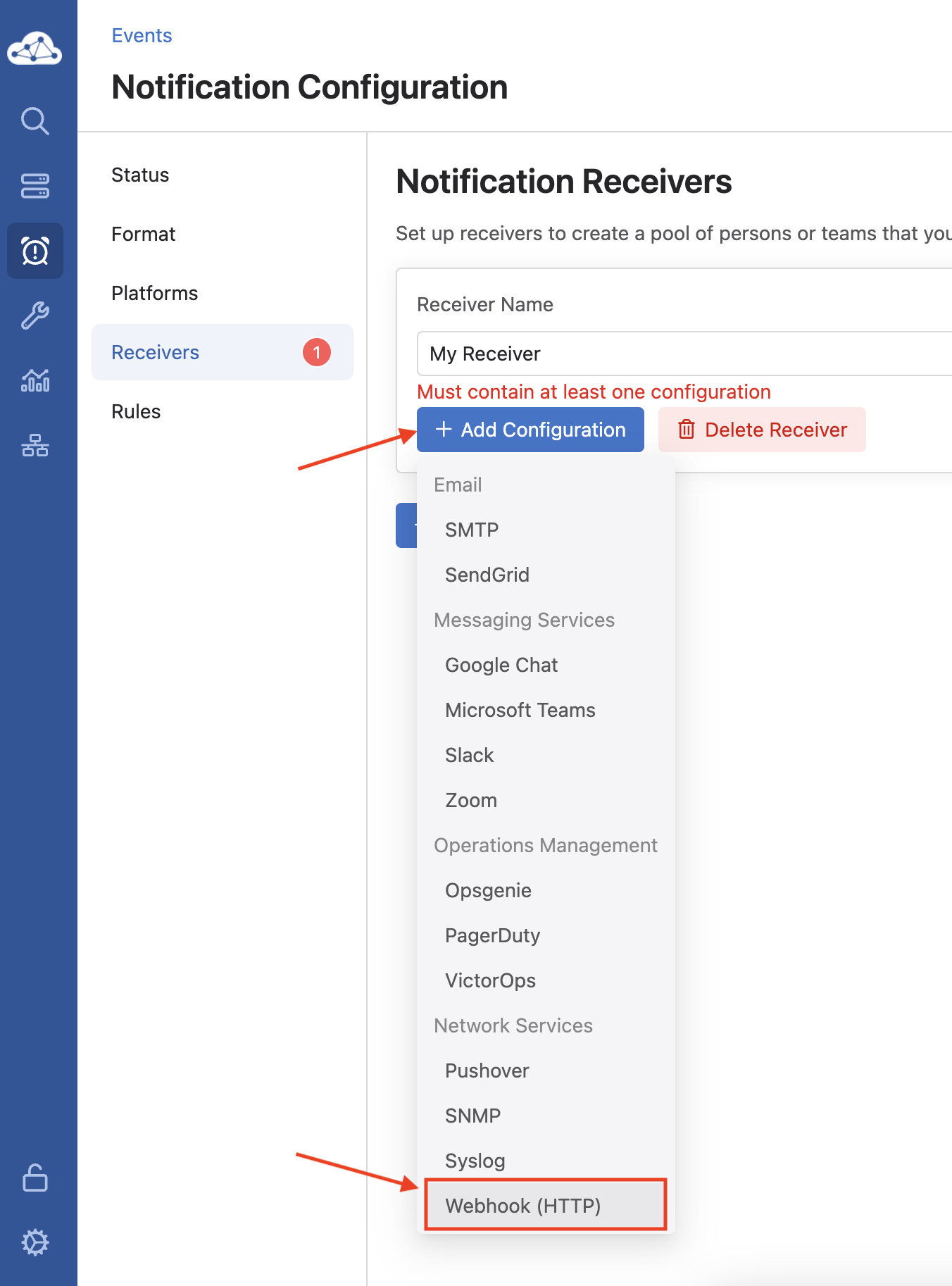 5. Click on + Add Configuration, then choose Webhook (HTTP).