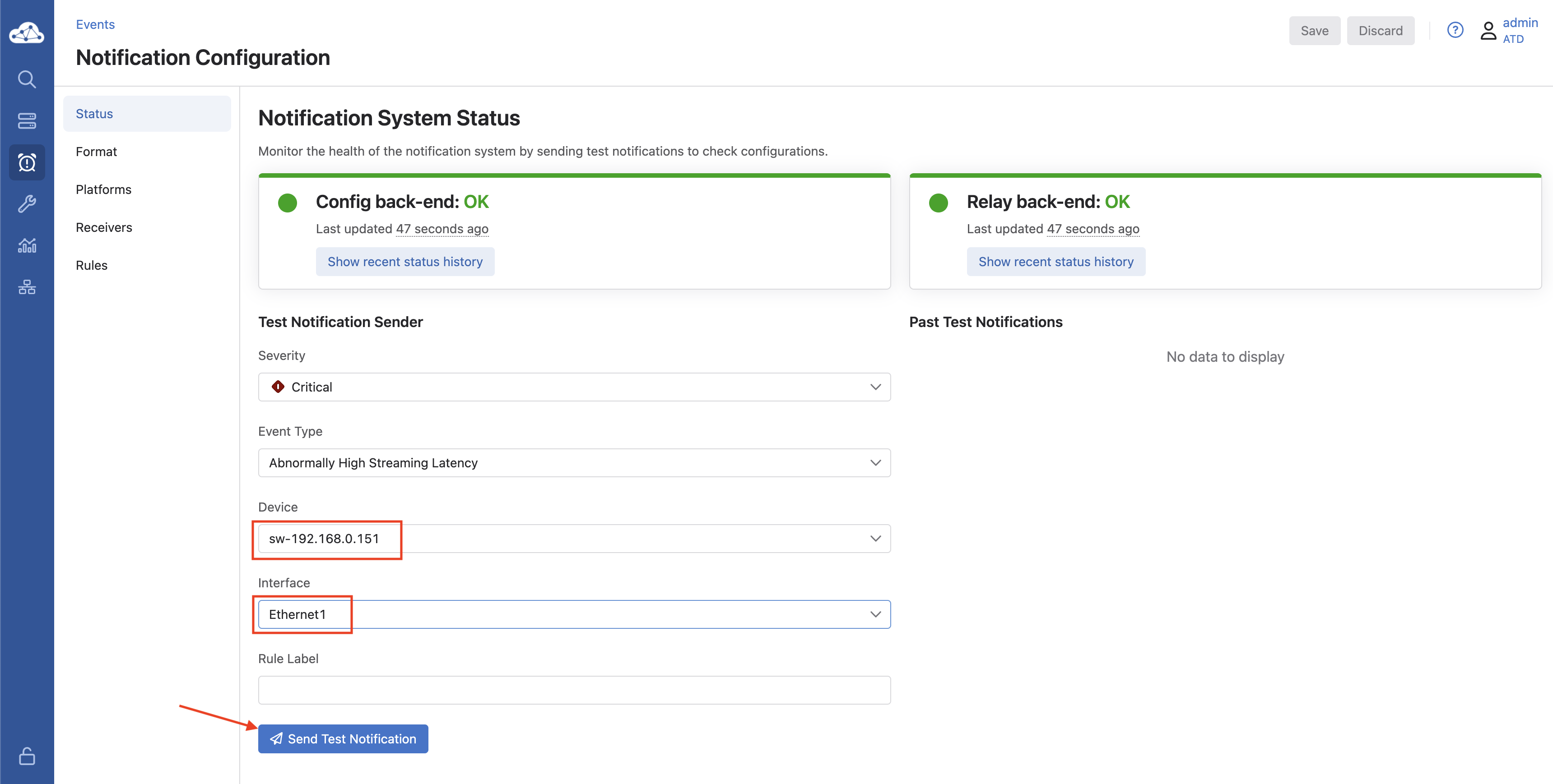 2. In the Test Notification Sender section, select any severity, and event type, any device, any interface, and then click Send Test Notification.