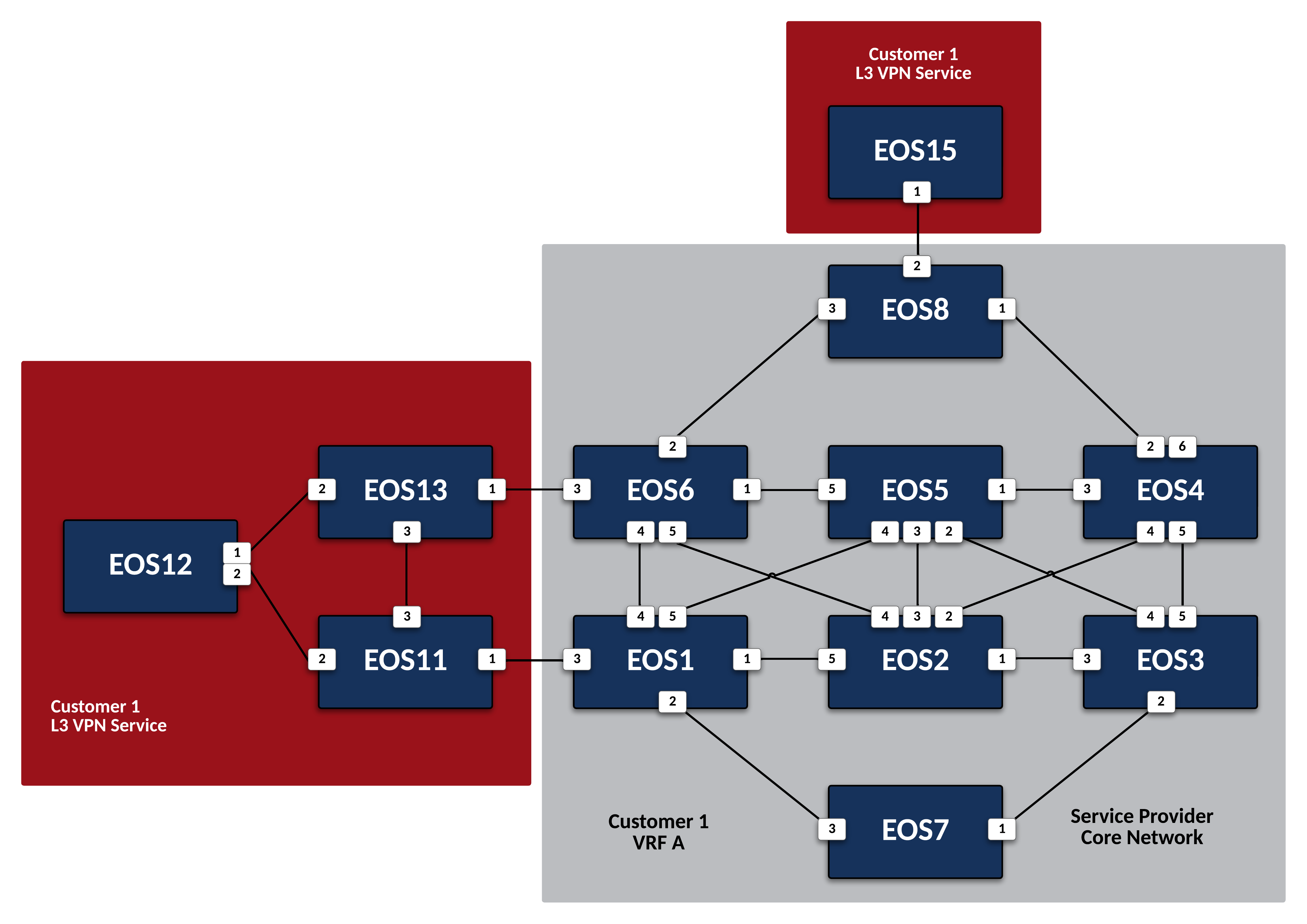 1. Customer-1 is attached to three Service Provider nodes, EOS1, EOS6 and EOS8. These will be our Provider Edge, or PE nodes. Since this customer will require a Layer 3 VPN Service, create an isolated VRF for their traffic and use IP-VPN to advertise the customer networks to other interested PEs.
