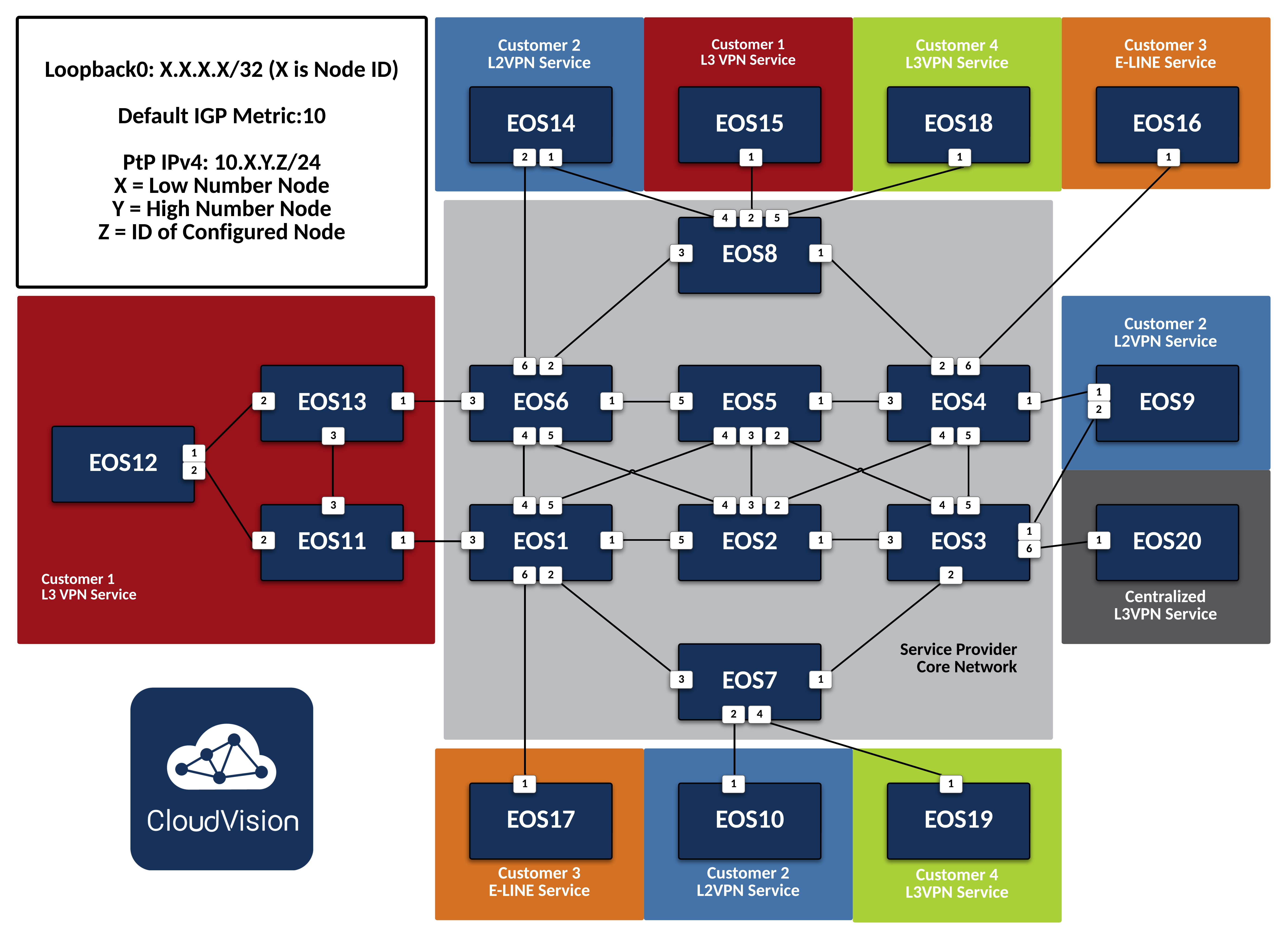 This is the full topology that will be used for the labs in the mesh section. Each section will highlight the individual nodes that are relevant to the service or protocol for that step. The Lab Guides in the Routing ATD are meant to provide example configurations with step-by-step instruction on setting up IS-IS, Segment Routing, BGP EVPN, etc. If you are already familiar with the protocols and configurations and would instead prefer to test your knowledge with only high-level direction on the steps necessary to deploy the Service Provider network, please refer to the Class Guides instead.