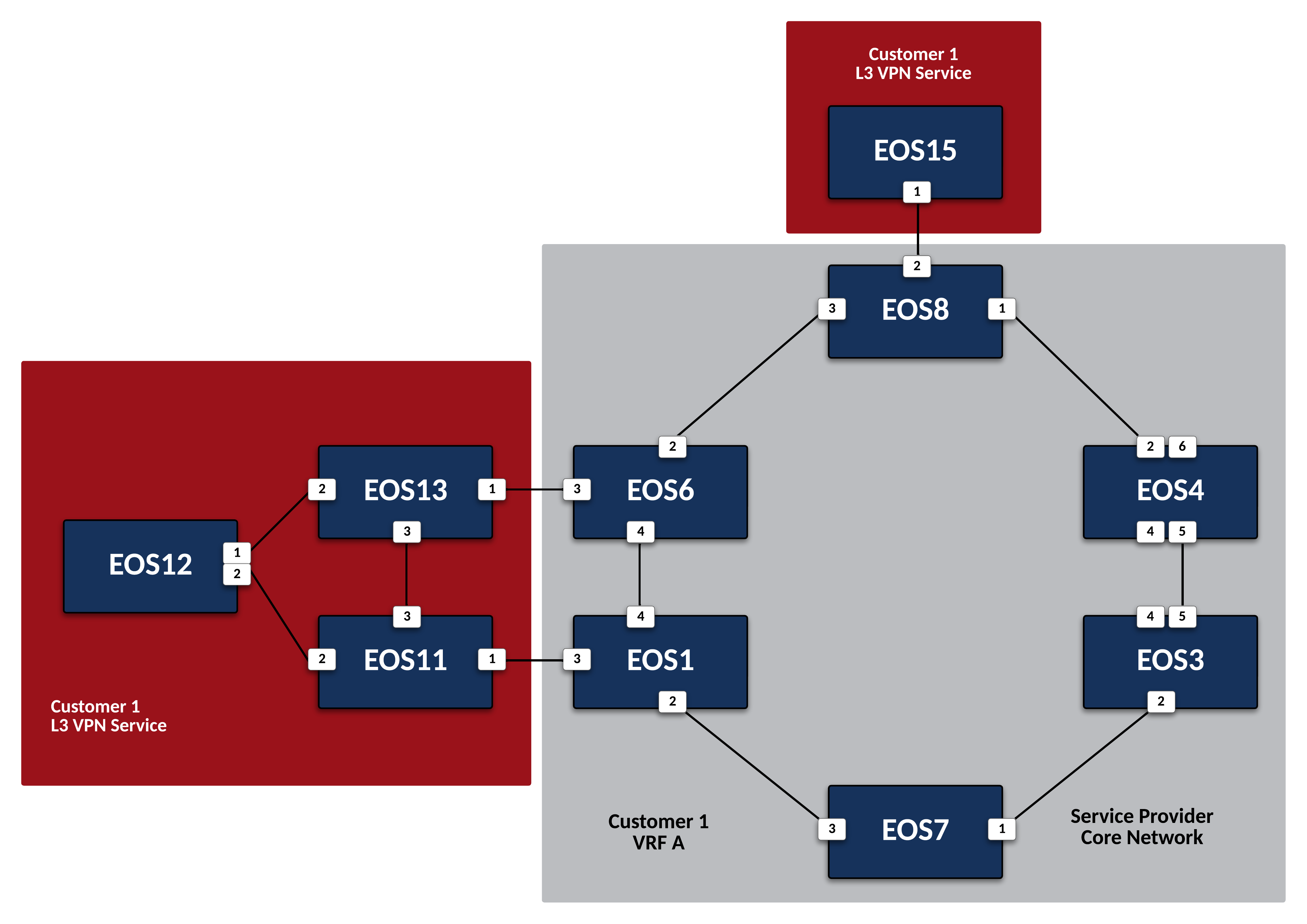 EOS8should have the following output from a show ip route vrf CUSTOMER-1 12.12.12.12 command:Note