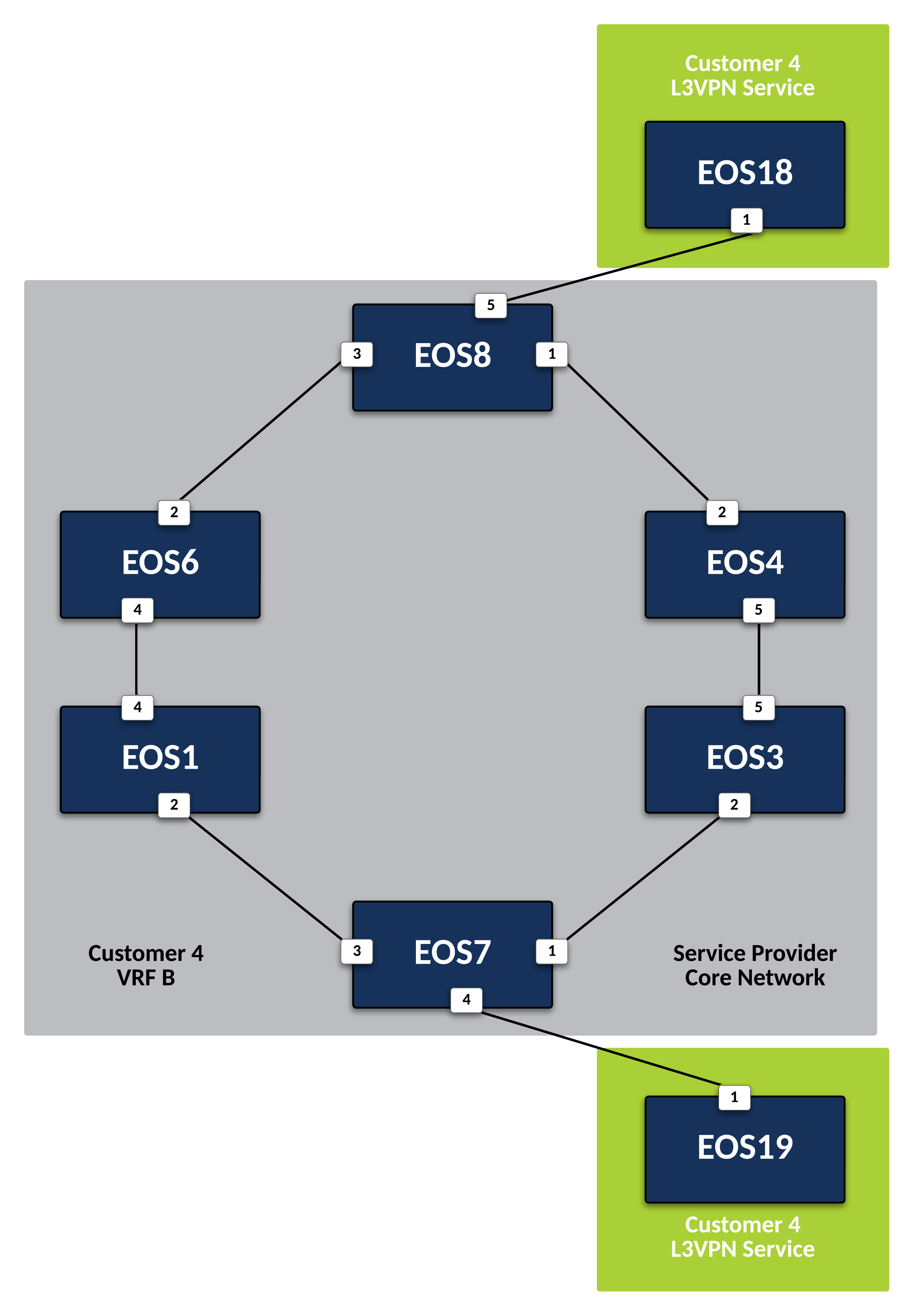 EOS7andEOS8. These will be our PE nodes. Since this customer will require a Layer 3 VPN Service, create an isolated VRF for their traffic and use EVPN to advertise the customer networks to other interested PEs.-