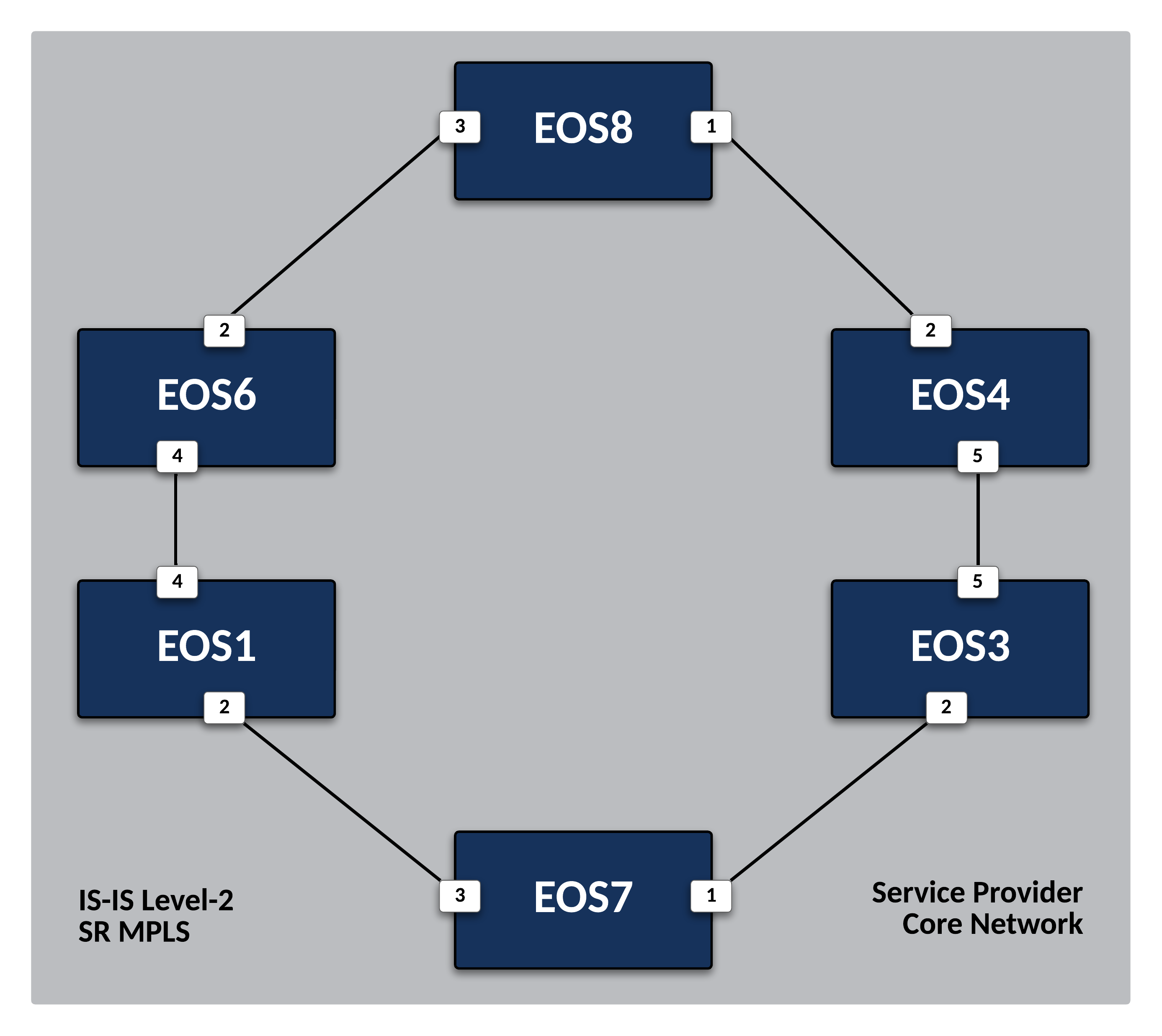 2. Repeat the above configuration steps on the other Service Provider nodes (EOS3, EOS4, and EOS6 - EOS8) while assigning a unique Node SID and router-id to each router based on the EOS ID and Loopback0 IP (i.e. EOS3 will have a Node SID index of 3).