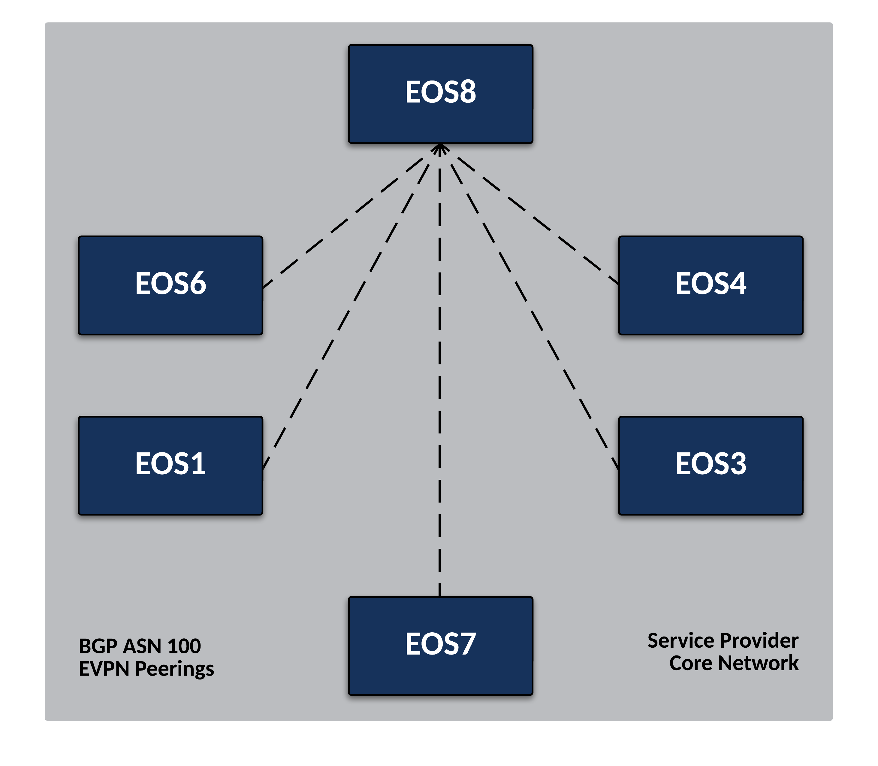 Since BGP EVPN is only providing our VPN control-plane, only Provider Edge (or PE) nodes, which are nodes attached to customer devices, will require the BGP peering. This is in contrast to Provider (or P) nodes, which only connect to other Service Provider nodes. In this topology, all active nodes are functioning as PE so will require BGP EVPN peerings to the Route Reflector.