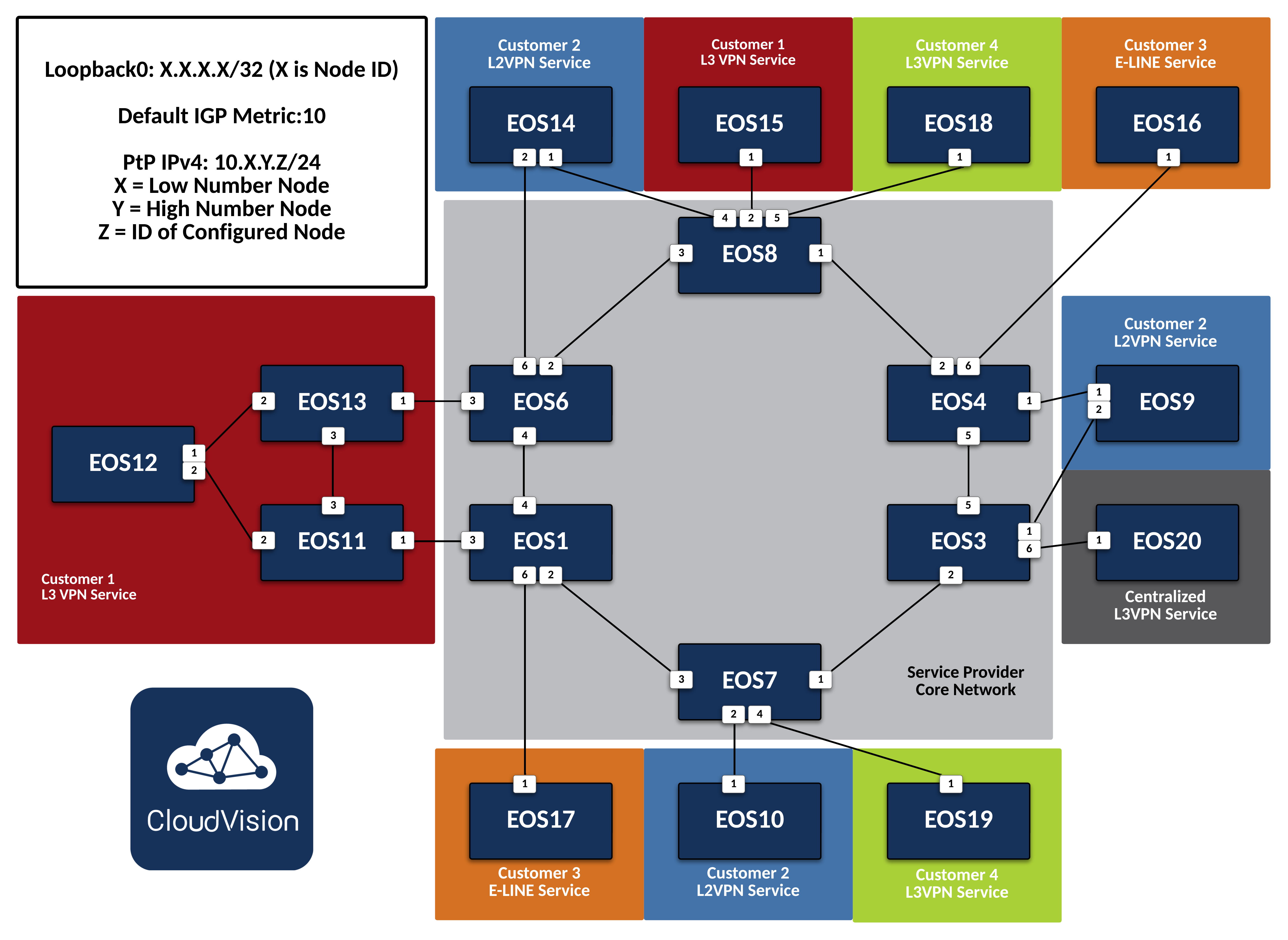This is the full topology that will be used for the labs in this section. Each section will highlight the individual nodes that are relevant to the service or protocol for that step. The Lab Guides in the Routing ATD are meant to provide example configurations with step-by-step instruction on setting up IS-IS, Segment Routing, BGP EVPN, etc. If you are already familiar with the protocols and configurations and would instead prefer to test your knowledge with only high-level direction on the steps necessary to deploy the Service Provider network, please refer to the Class Guides instead.