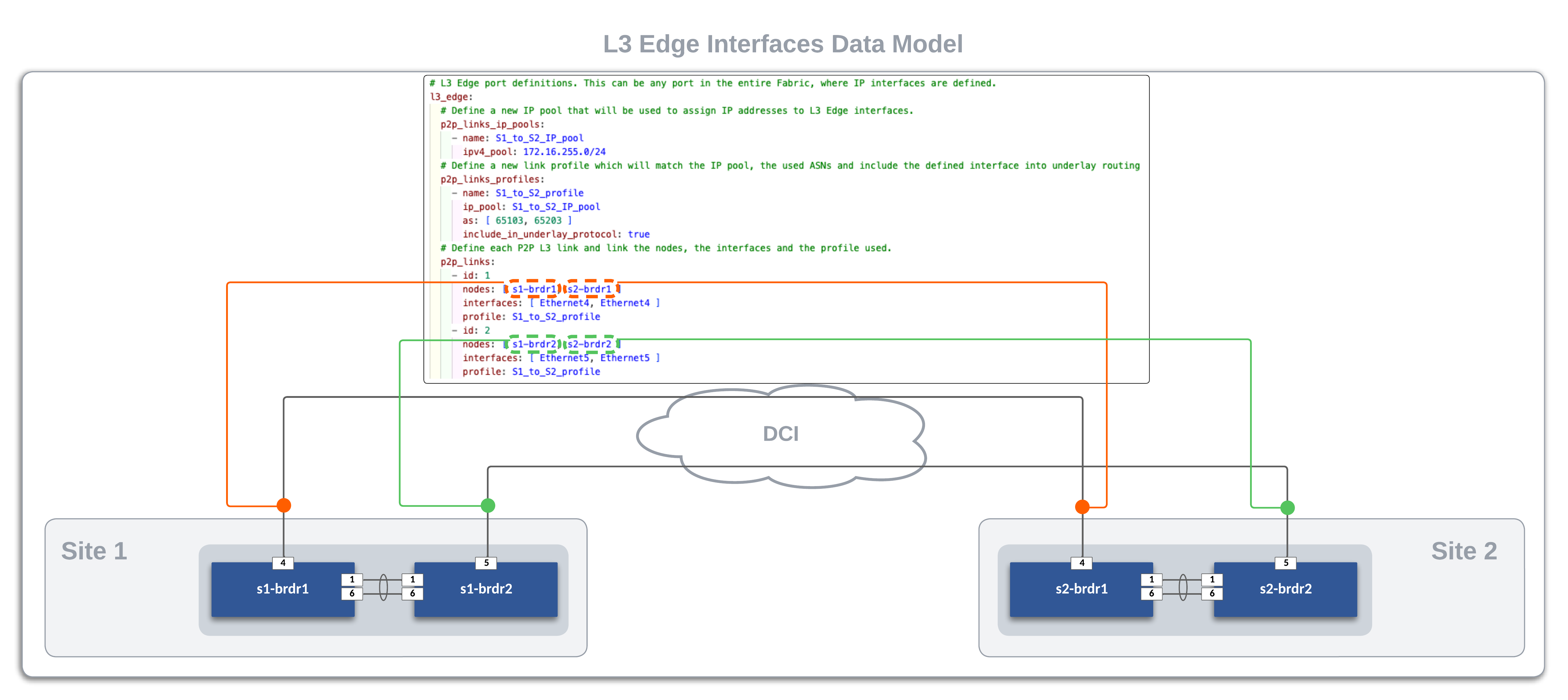 Inside the same global_dc_vars file, we define how each site is linked to each other through their respective border leafs. In our example, the core switches are simply configured with layer 2 interfaces so each border leaf connects to its peer in a point to point manner. The l3_edge data model for both sites follows.