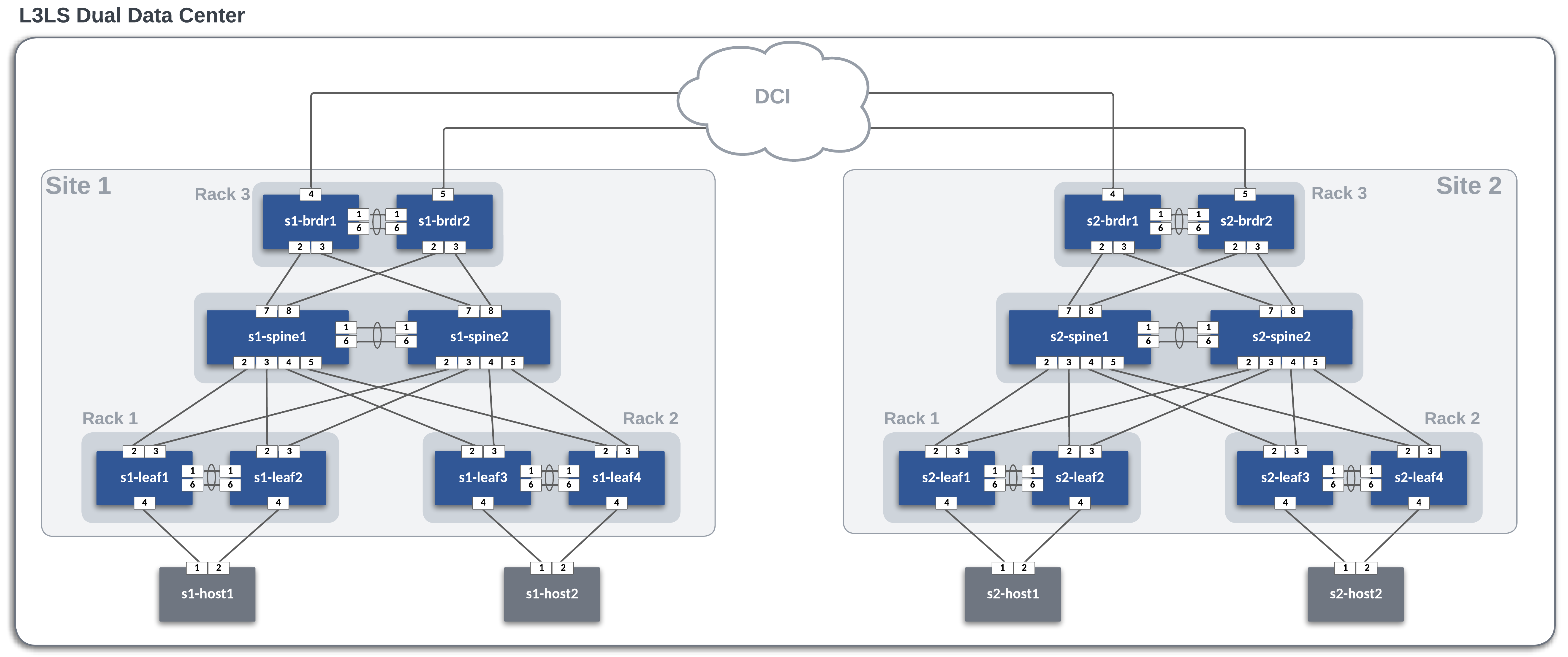 Throughout this section, we will use the following dual data center topology. Click on the image to zoom in for details.