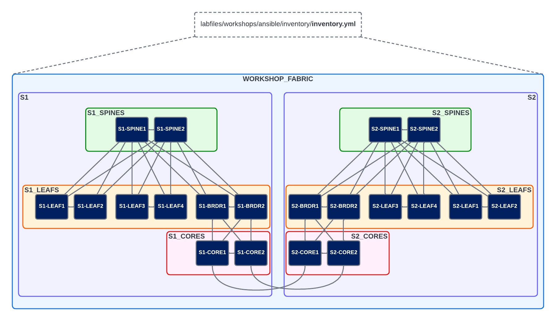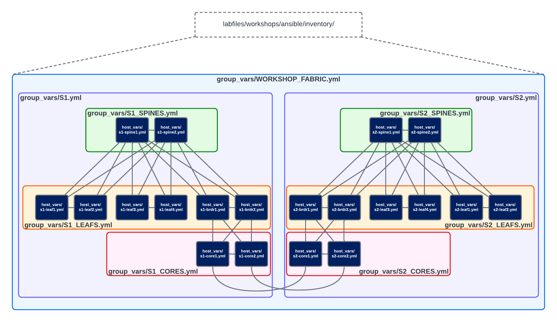 In the example above, if we were to define a variable in the ~/project/labfiles/ci-workshops-fundamentals/ansible/inventory/group_vars/WORKSHOP_FABRIC.yml file, then all Managed Nodes contained within that group in our inventory file would inherit that variable. The contents of our WORKSHOP_FABRIC.yml file can be seen below: