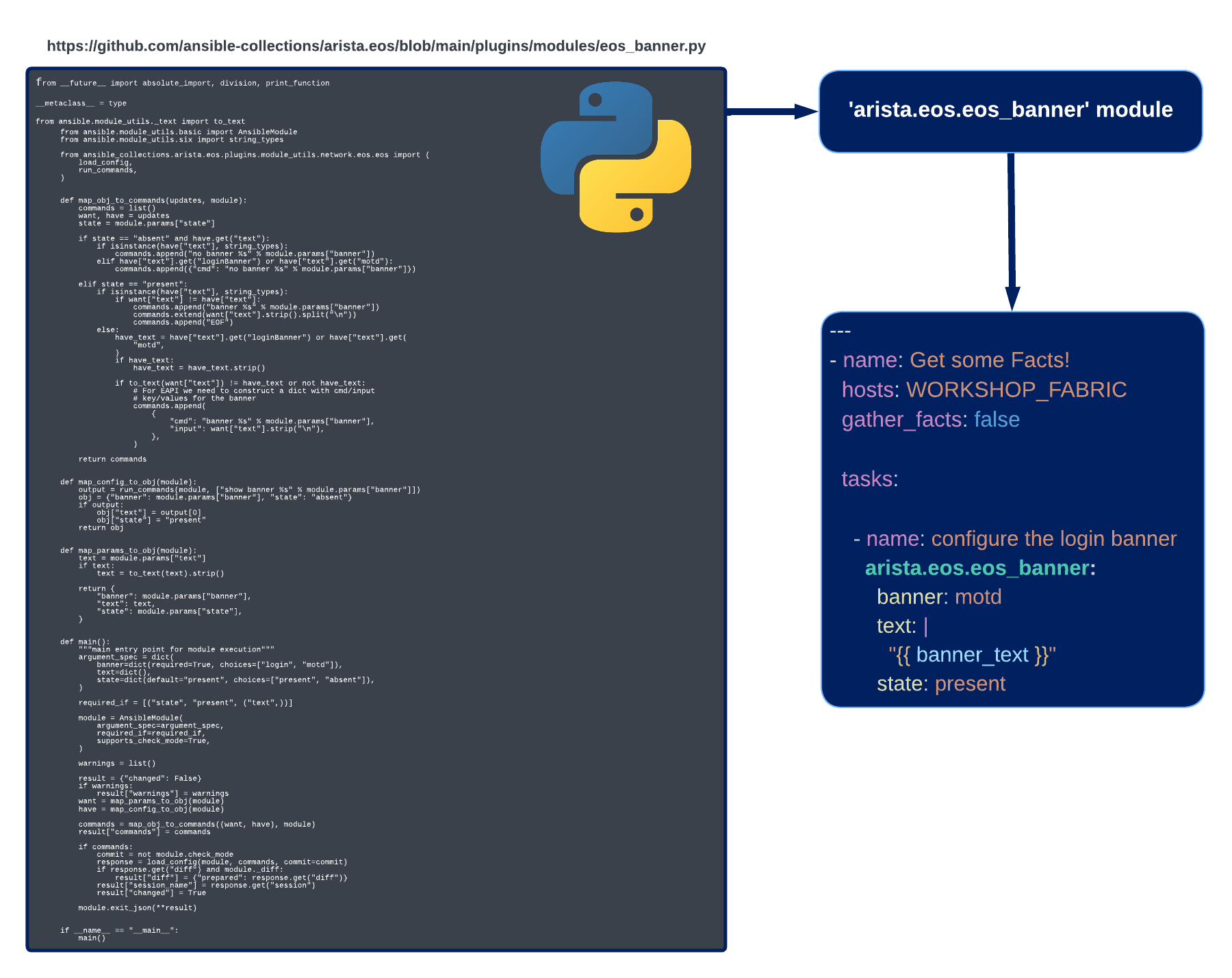 It's a lot easier to call eos_banner in a playbook than it is to write, in a reusable fashion, all of that Python code! The abstraction of the detailed "behind the scenes" code is why modules are such as big reason Ansible is easy to get started with.