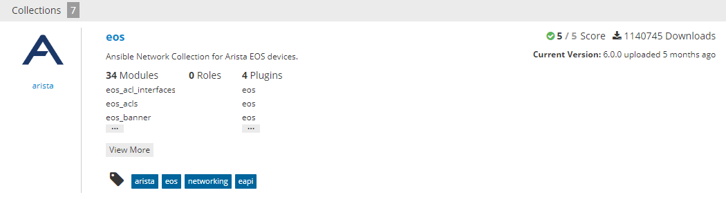 Finally, we have any parameters associated with a module. Some of these parameters may be required, while others may be optional. The best way to learn about a module is to find its documentation out on Ansible Galaxy by searching for it. For example, when we search for eos_ on Ansible Galaxy, we get the output below: