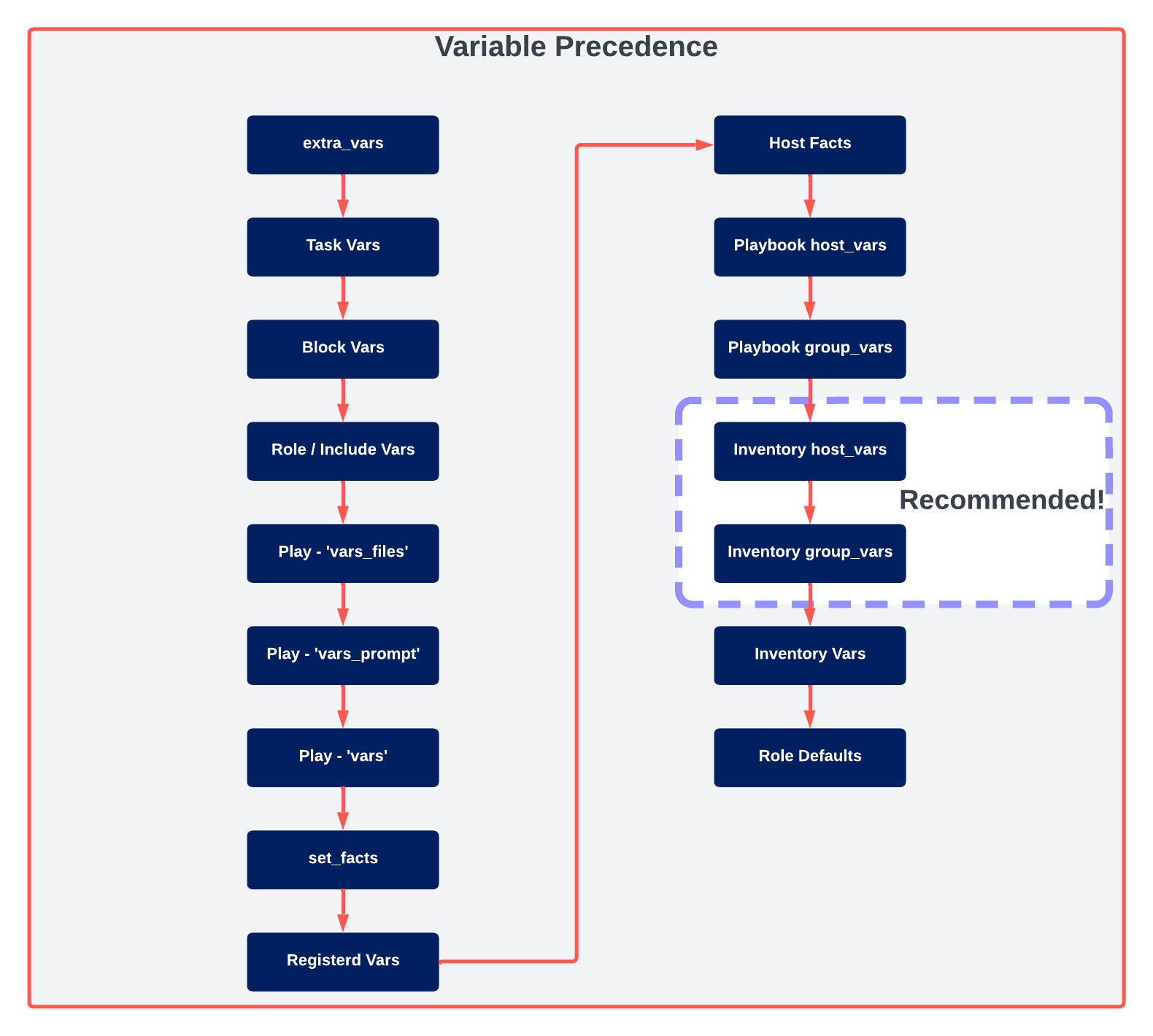 As can be expected, there are a LOT of places where we can define variables. Each option has its use case, but the general recommendation is to use host_vars and group_vars as much as possible.