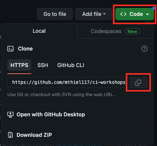 Cloning a repository allows us to make a local copy of a project on GitHub. In the previous step, you forked a repository to your local GitHub account. Navigate to your forked repo in GitHub. From there, click on the green code button and copy the URL of the forked repository.