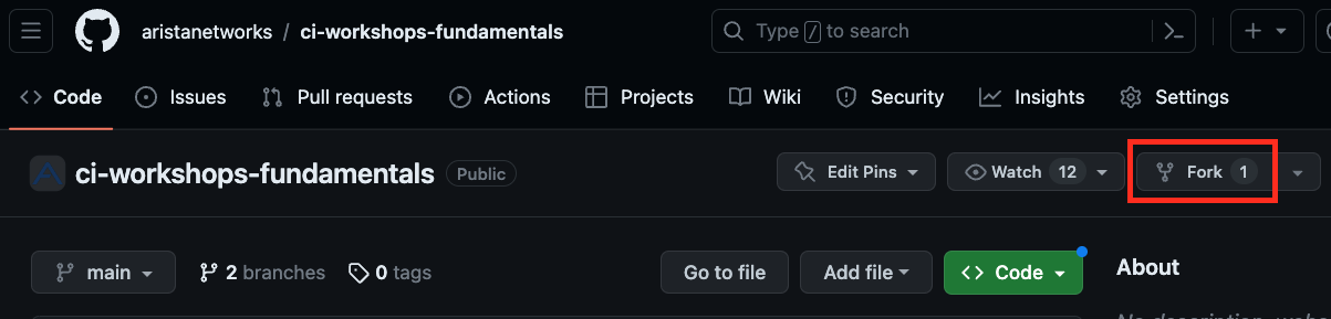 Fork the example Arista CI Fundamentals repository to make your copy.