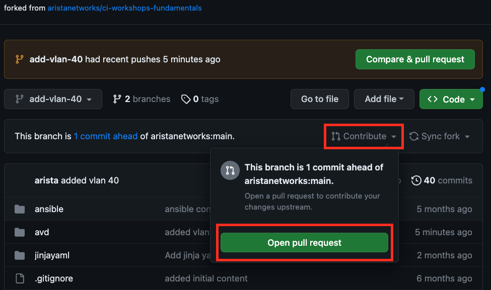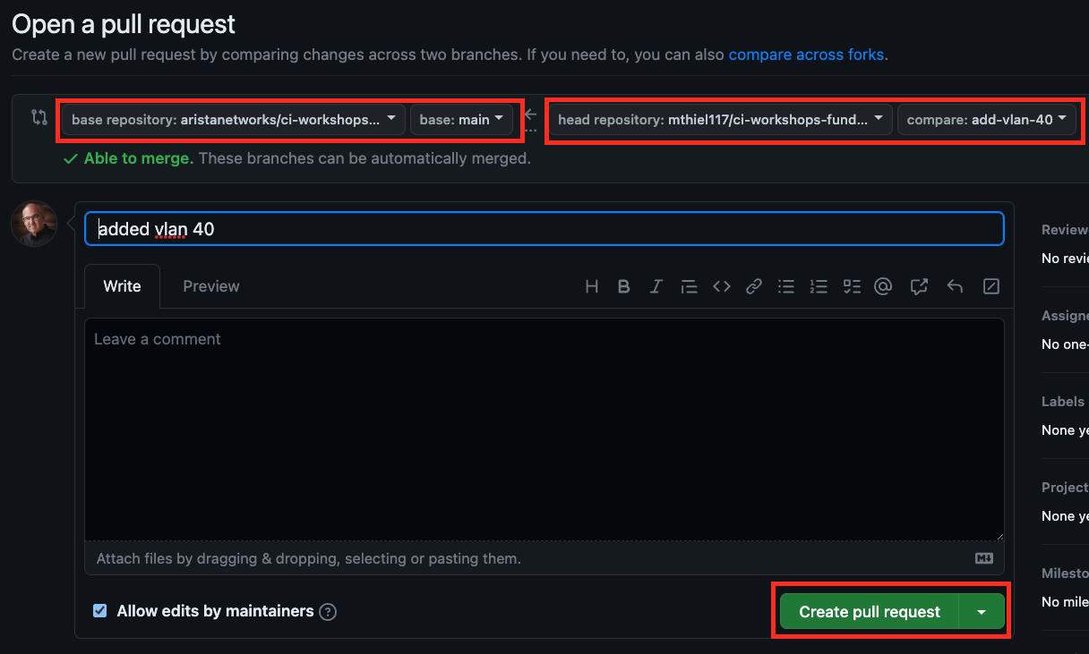 base repository:is set toaristanetworks/ci-workshops-fundamentalsandbase:is set tomain. Set thehead repository:to your forked repo andcompare:to theadd-vlan-40branch.