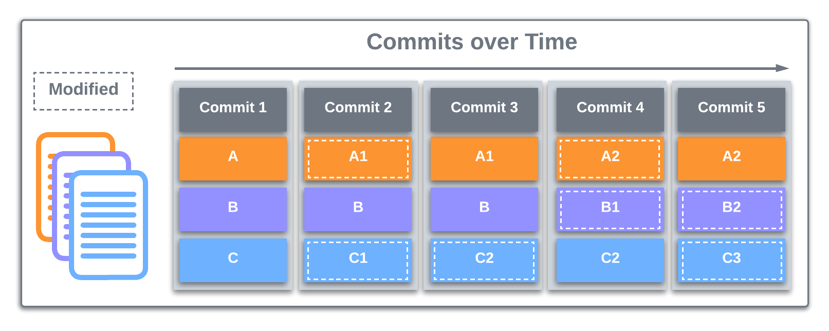 In this section, we will explore a brief introduction of Git. We will cover the installation and basic commands used with Git. Git is the most commonly used version control system. Git tracks changes to files allowing you to revert to specific versions. File changes are tracked by storing snapshots (commits) of the files over time. In the image below, the content of files A, B, and C change over time. Git allows you to roll back to any previous commit.