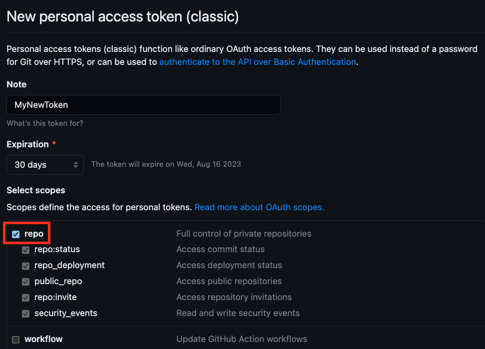 Select the scopes to grant to this token. To use your token to access repositories from the command line, select repo. A token with no assigned scopes can only access public information.