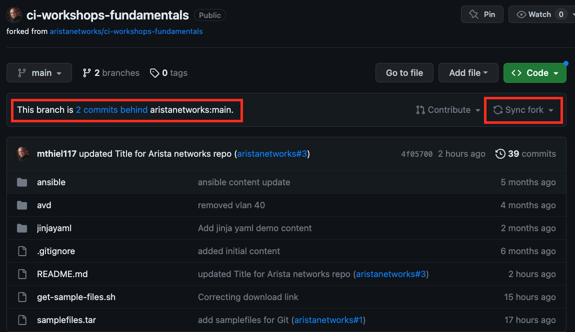 - From GitHub.com, navigate to the Arista CI Fundamentals repository.