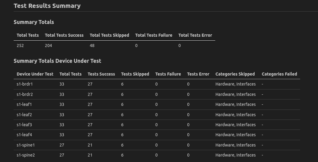 anta_report_hide_statusesvariable.--- - name: Validate Network State hosts: "{{ target_hosts }}" connection: httpapi gather_facts: false tasks: - name: validate states on EOS devices ansible.builtin.import_role: name: arista.avd.anta_runner vars: avd_catalogs_filters: - skip_tests: [VerifyMemoryUtilization, VerifyLoggingErrors] anta_report_hide_statuses: [success, skipped] -