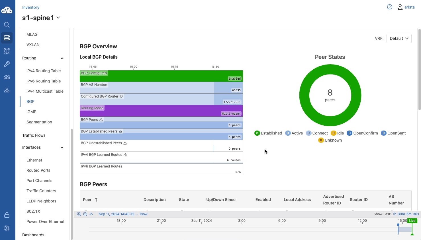 Find and click on s1-spine1, then select BGP on the left navigation bar. Here we can see the updated BGP ASN and Neighbor settings. We can also use the timeline view of BGP telemetry to see when the changes occurred.