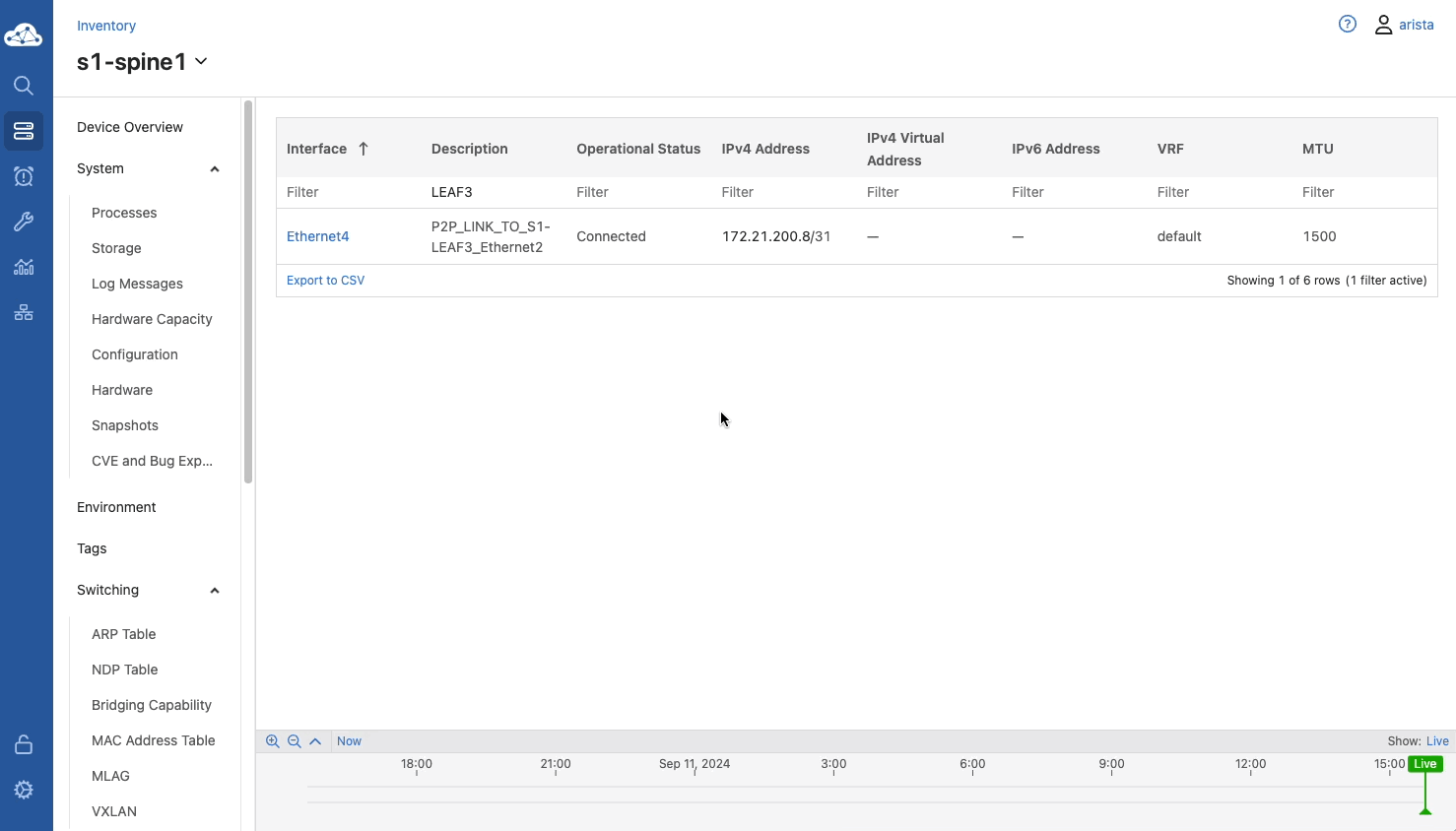 Use the device name pull-down menu and select s1-leaf1 to hop to the L3 Interface details of that device. Repeat for other devices in the fabric as desired.