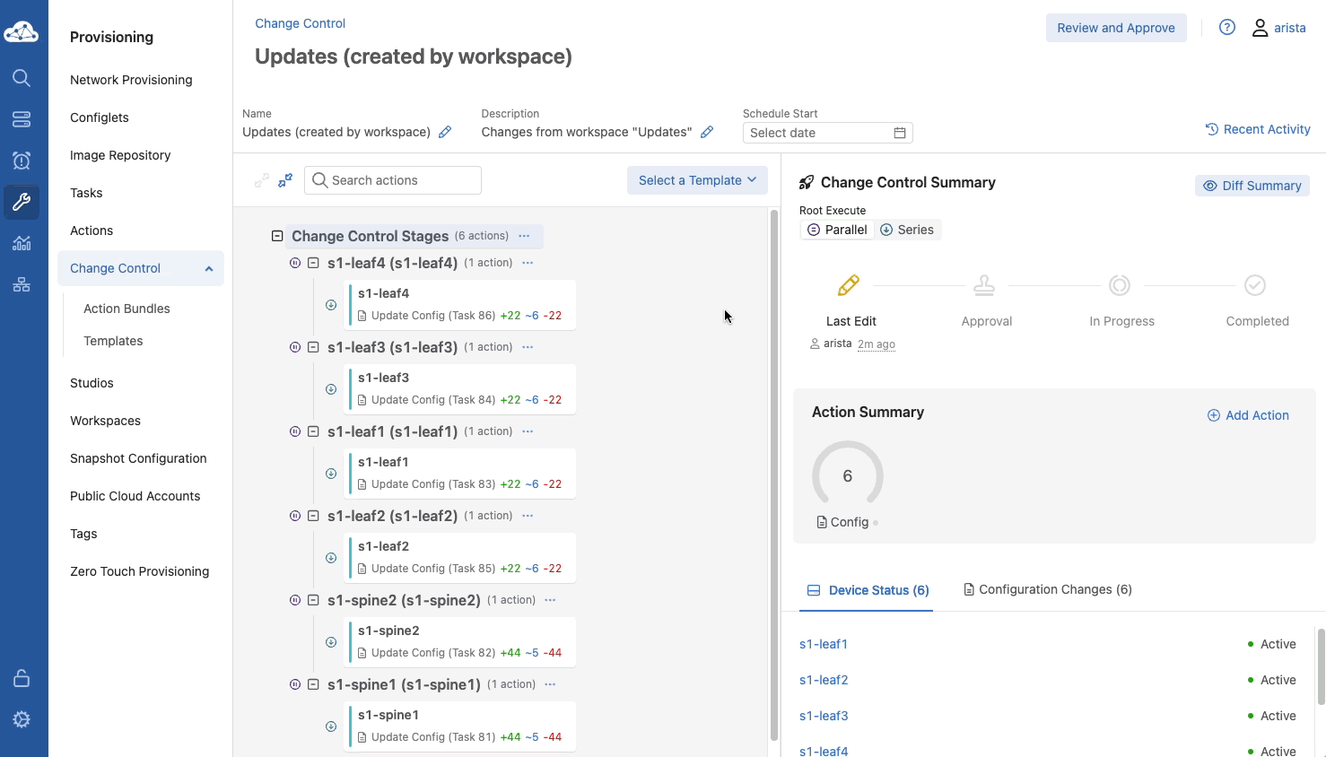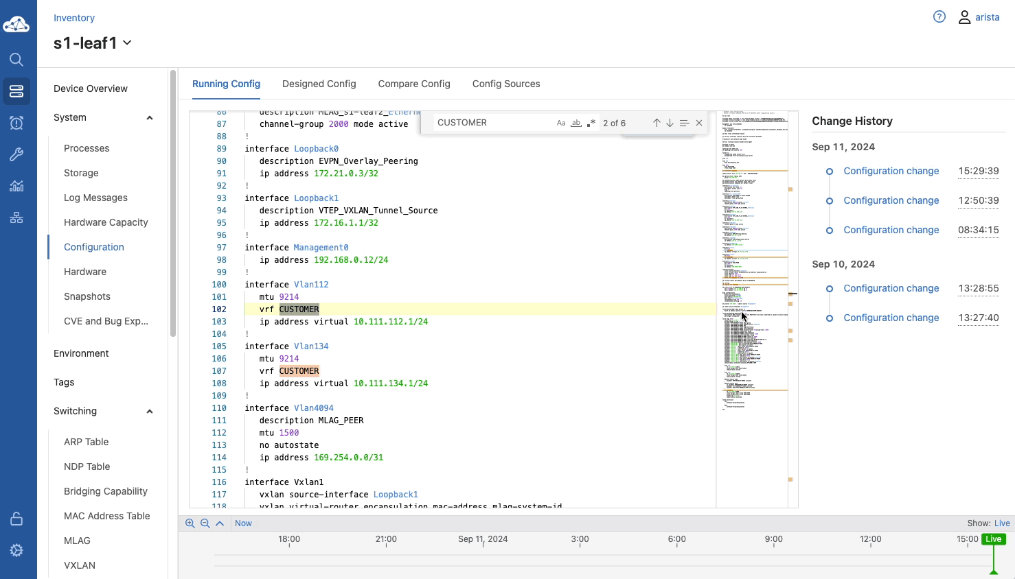 Notice that CloudVision registers and tracks all configuration changes on the device. You can select the latest change to see the configuration changes pushed via our Studios update.