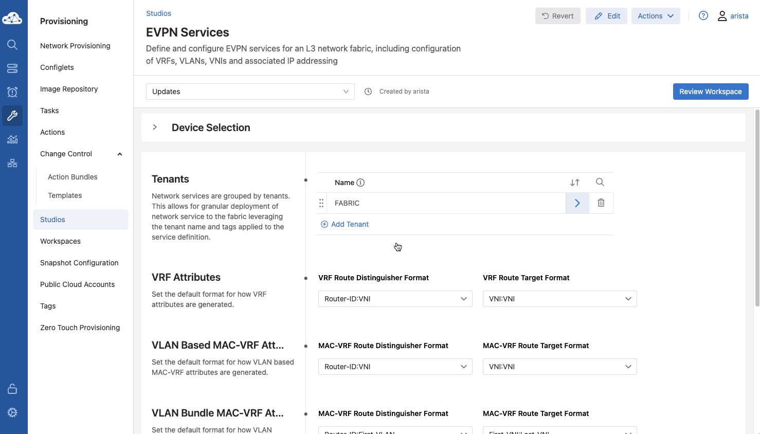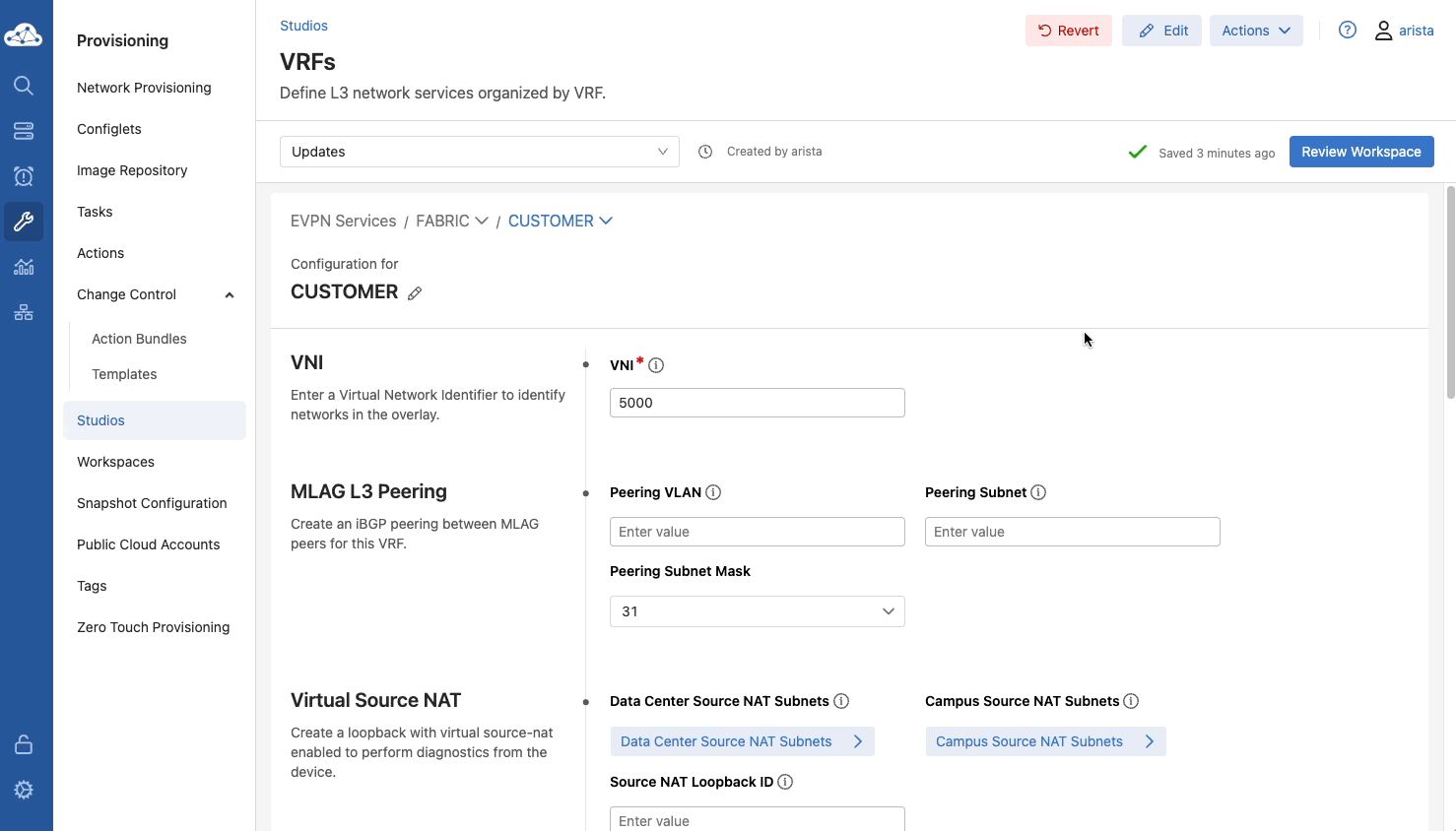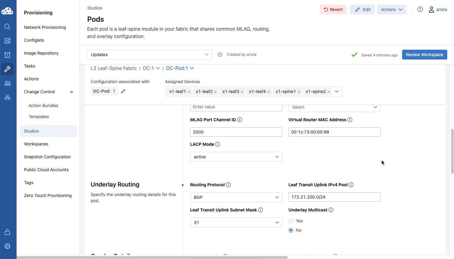 Let's assume that after the network configuration has been generated and deployed by Studios, we want to make a change to some of the settings we used. Because these configurations are generated by the data models inside of CloudVision, we'll see how simple it is to made fabric-wide changes with a few steps.