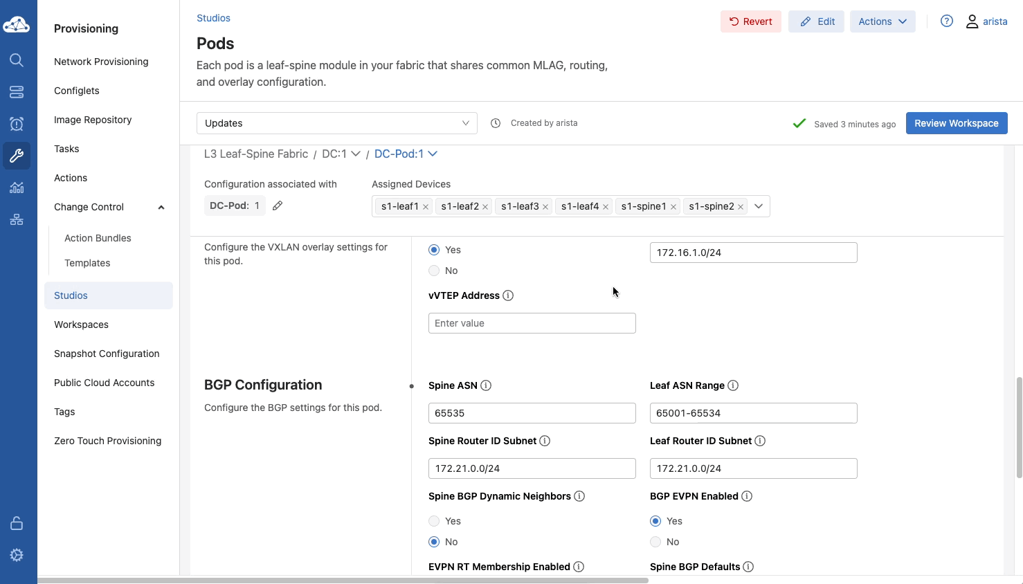 The goal of this lab is to make changes to an existing L3LS deployment using Studios. This will highlight the flexibility and abstraction capabilities of CloudVision Studios. We will continue the work from the previous L3LS and EVPN lab. We will modify the default settings and customize them for our deployment. You will first verify the existing configuration, then modify the Spine and Leaf Router IDs, BGP ASN, and the existing VRF.