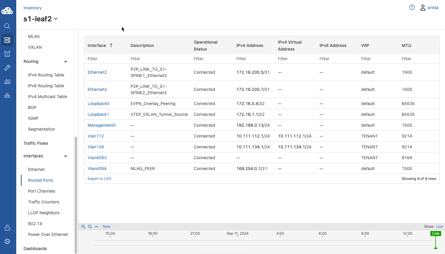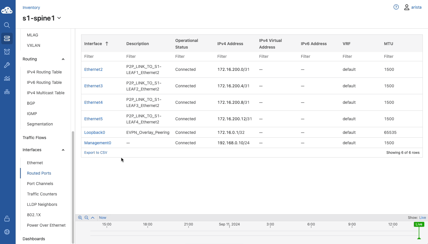 Use the device name pull-down menu to select s1-spine1 again, then click Routed Ports under Interfaces section in the left navigation bar to view the assigned interface IP addresses.