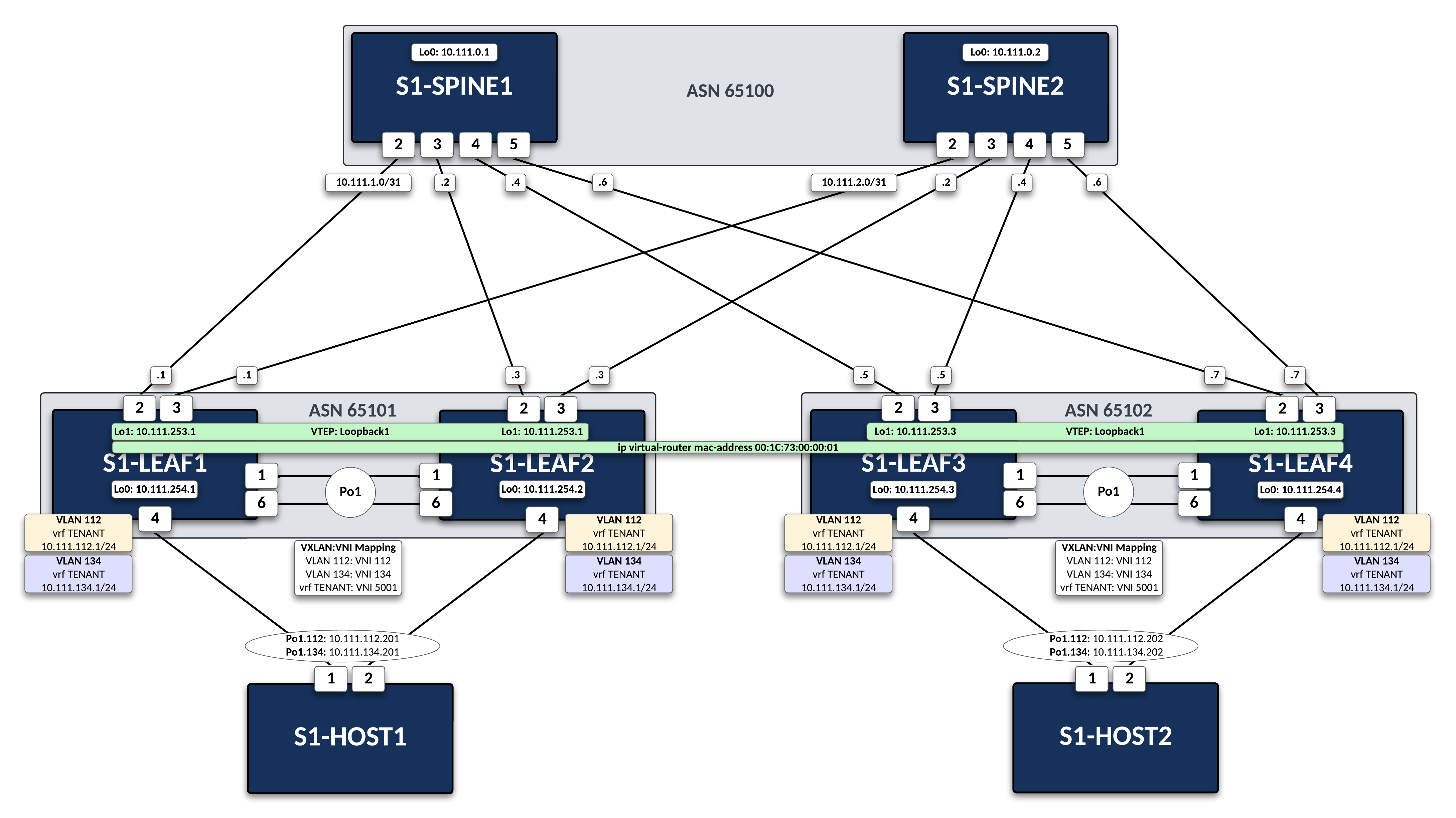 This lab exercise is focused on the VXLAN EVPN configuration. IP addresses, MLAG and BGP Underlay are already configured.